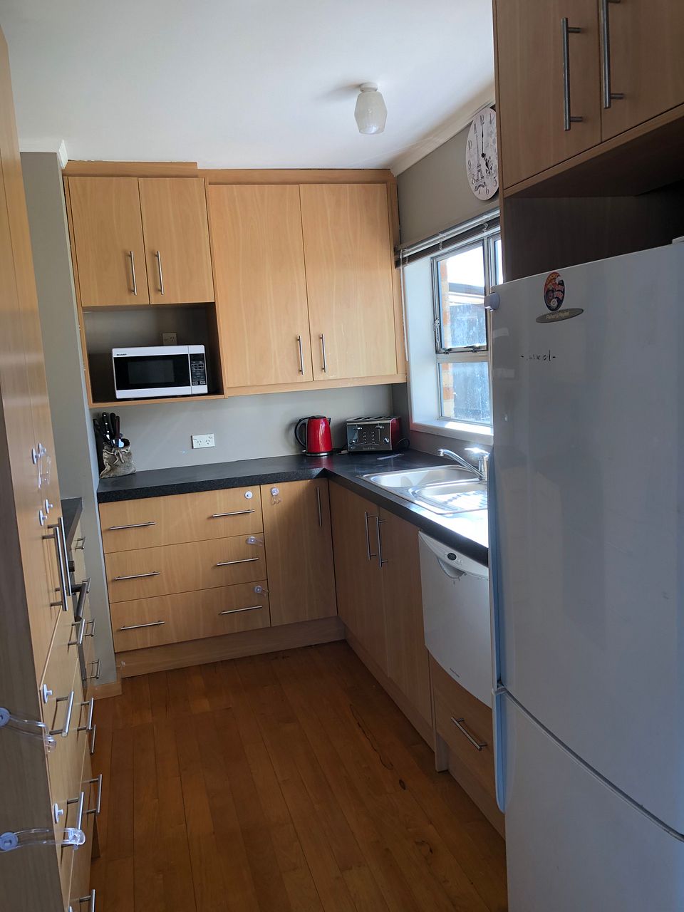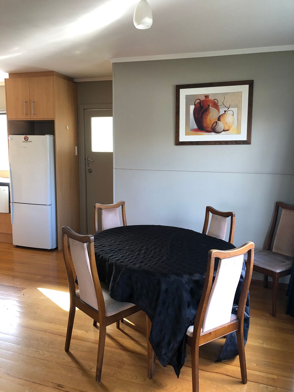 6 seater dining table, microwave, single dish drawer, fridge/freezer and fully functional kitchen with all crockery, pots, etc.