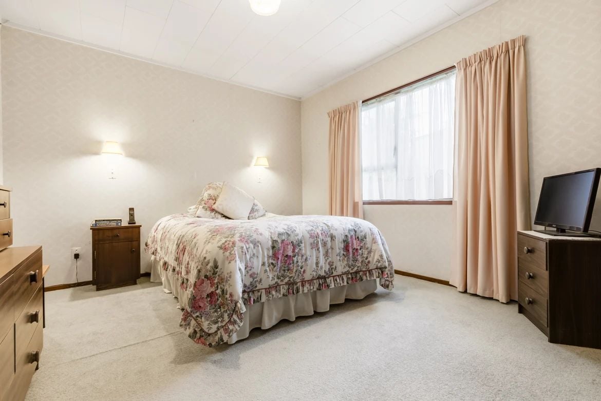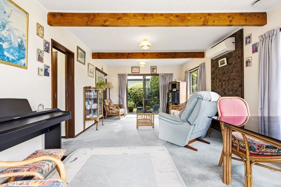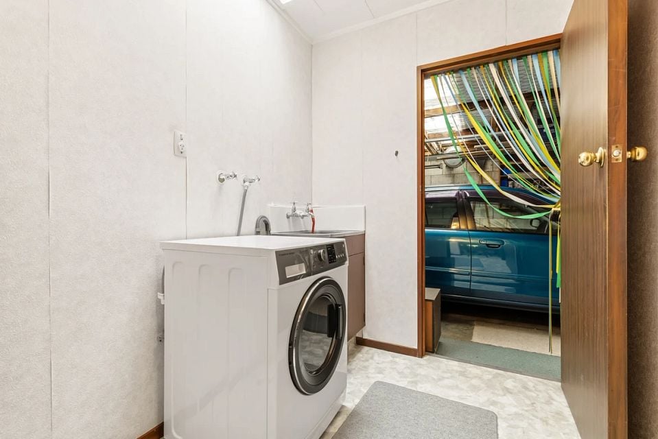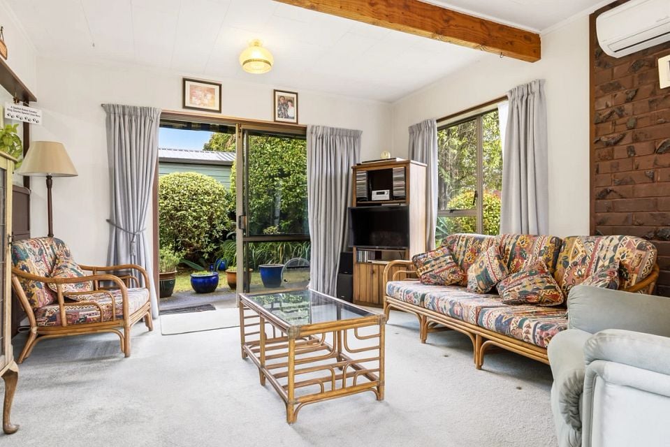 The home includes a tidy bathroom, a separate toilet, and a spacious laundry with extra storage. Year-round comfort is ensured with a heat pump and additional heating for winter.