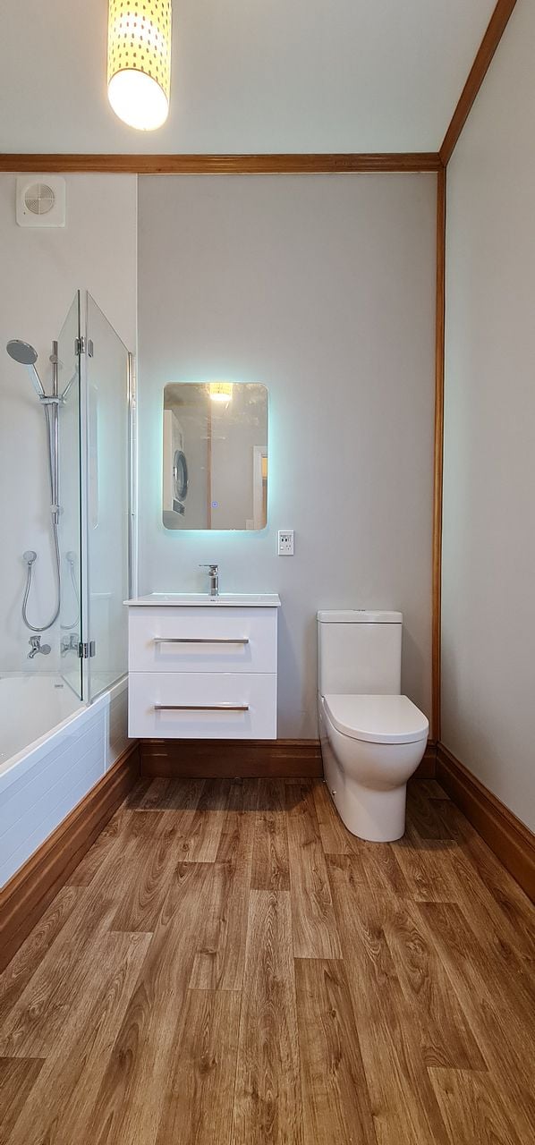 We did a full strip out and added a New shower over bath, toilet, vanity, wall linings and flooring, recycled Rimu skirting and architaves.