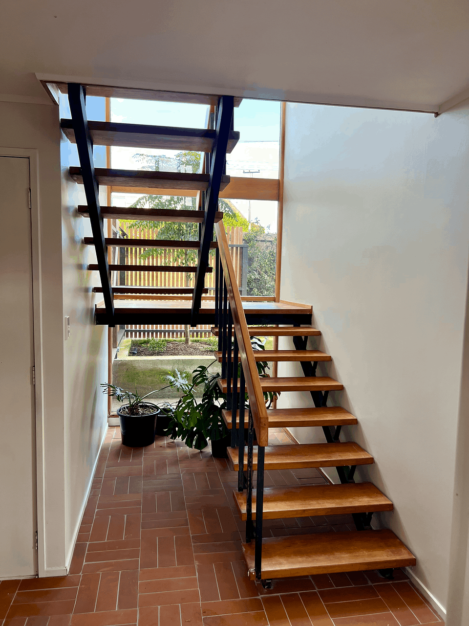 Large balcony/deck, plus a courtyard area on the ground floor and vegetable garden in the front garden.