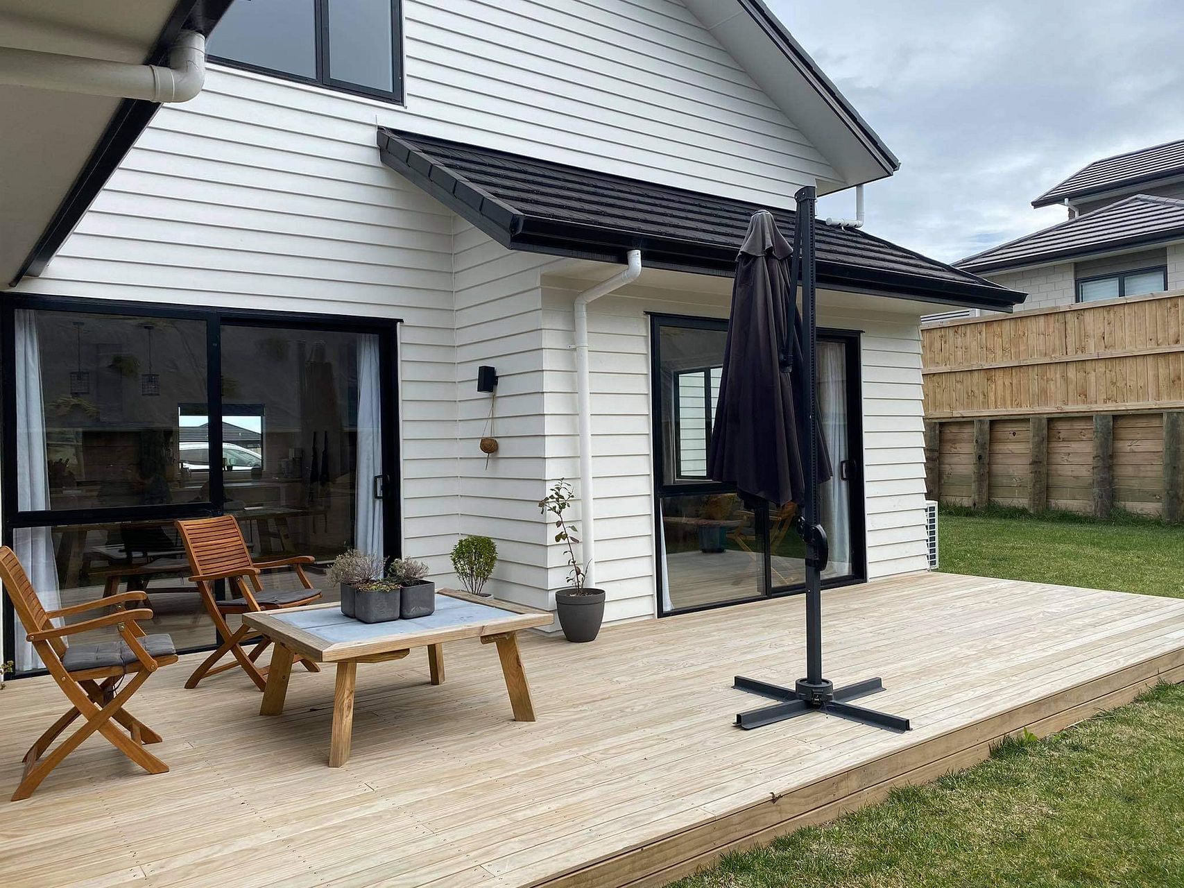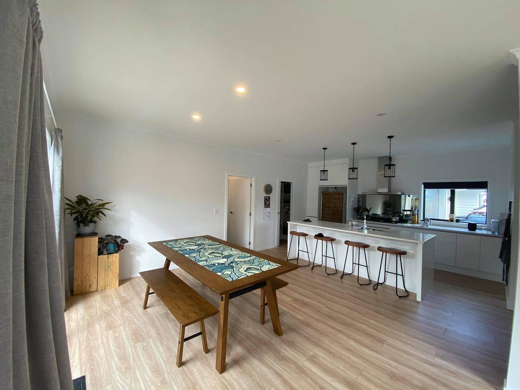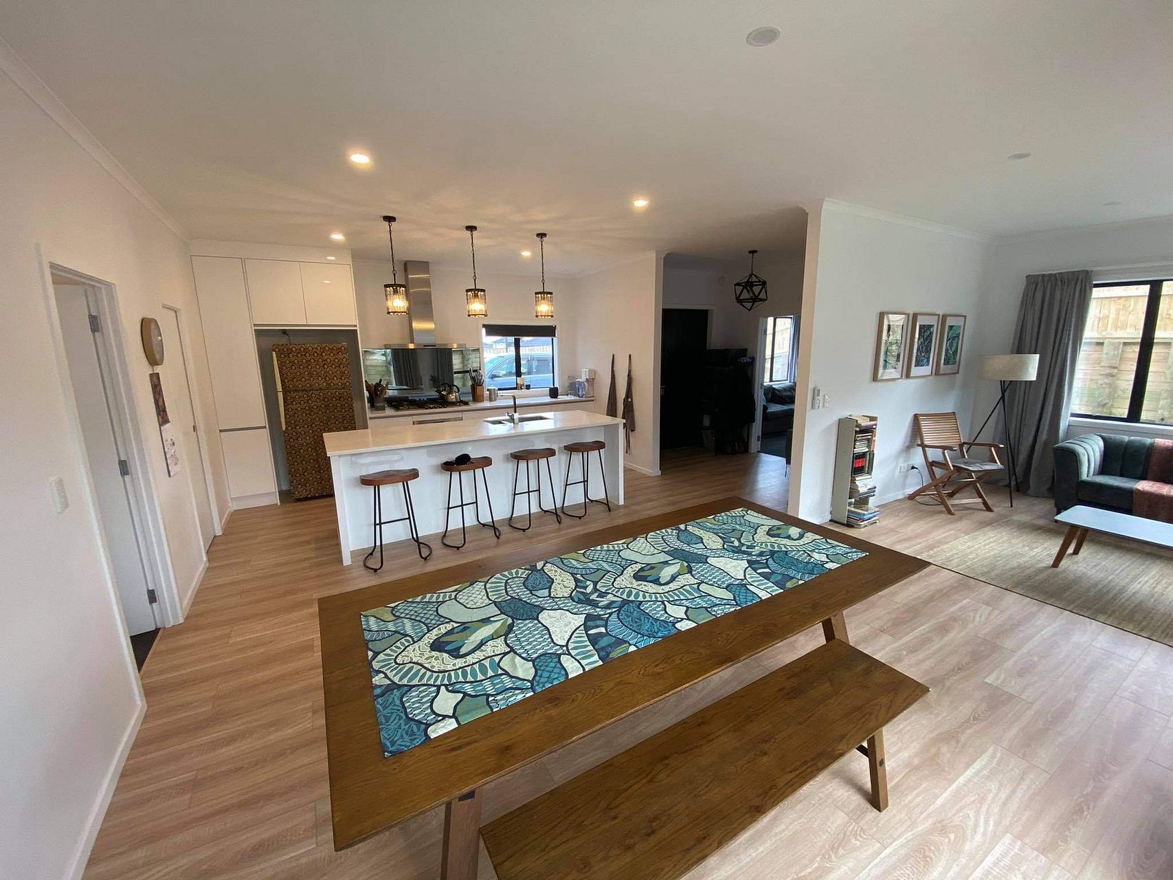 New 4 bedroom house with an open plan kitchen dining and living areas incorporating a heatpump, double glazed windows and sliding doors that open onto an adjoining deck.