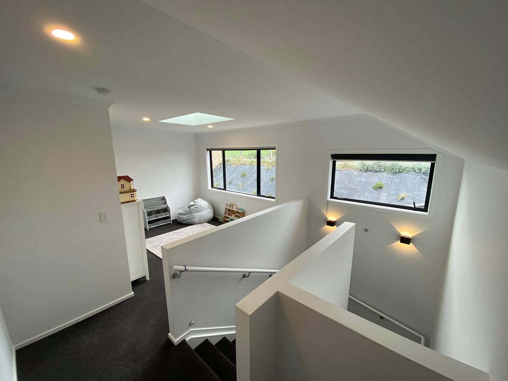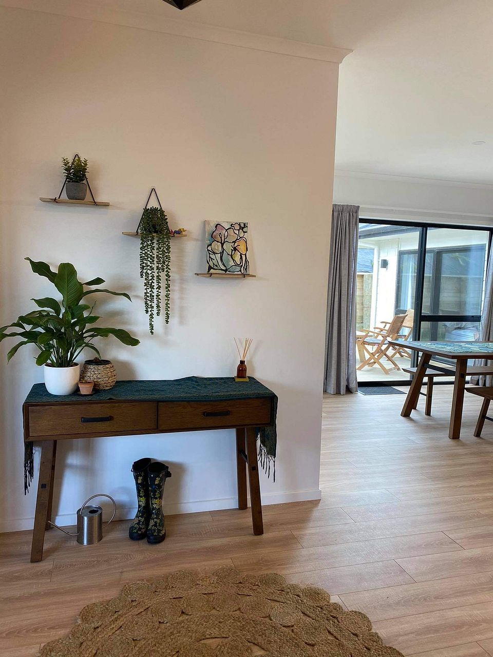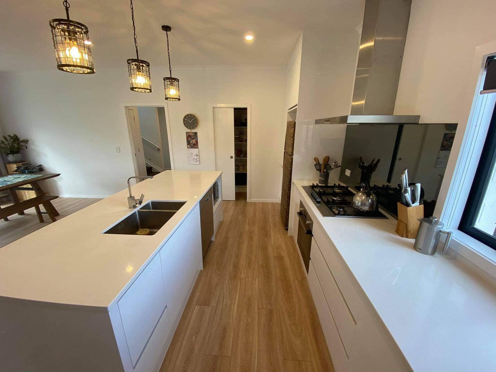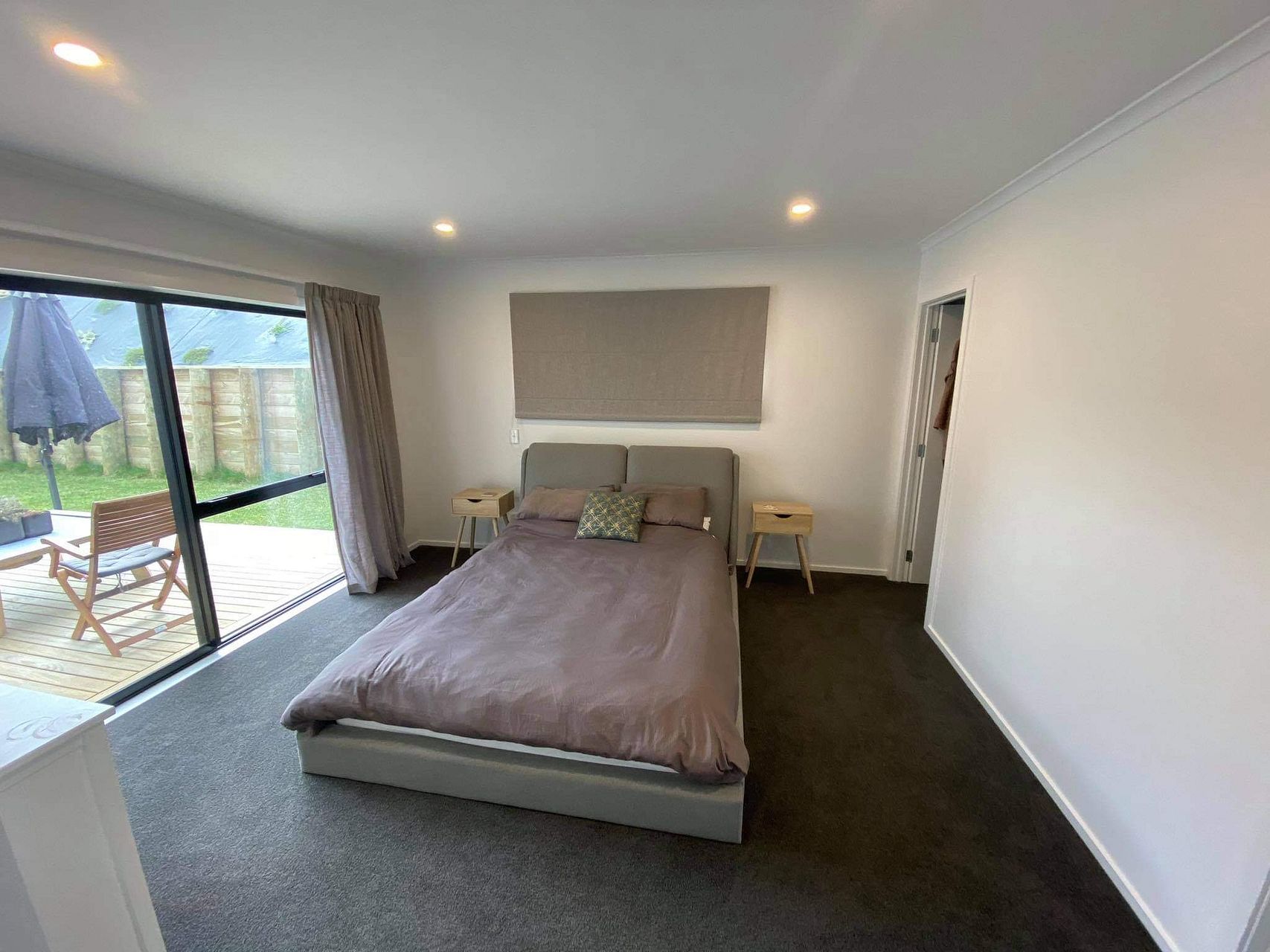 New 4 bedroom house with an open plan kitchen dining and living areas incorporating a heatpump, double glazed windows and sliding doors that open onto an adjoining deck.