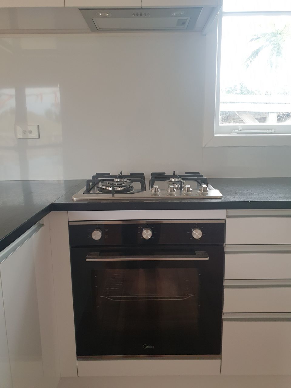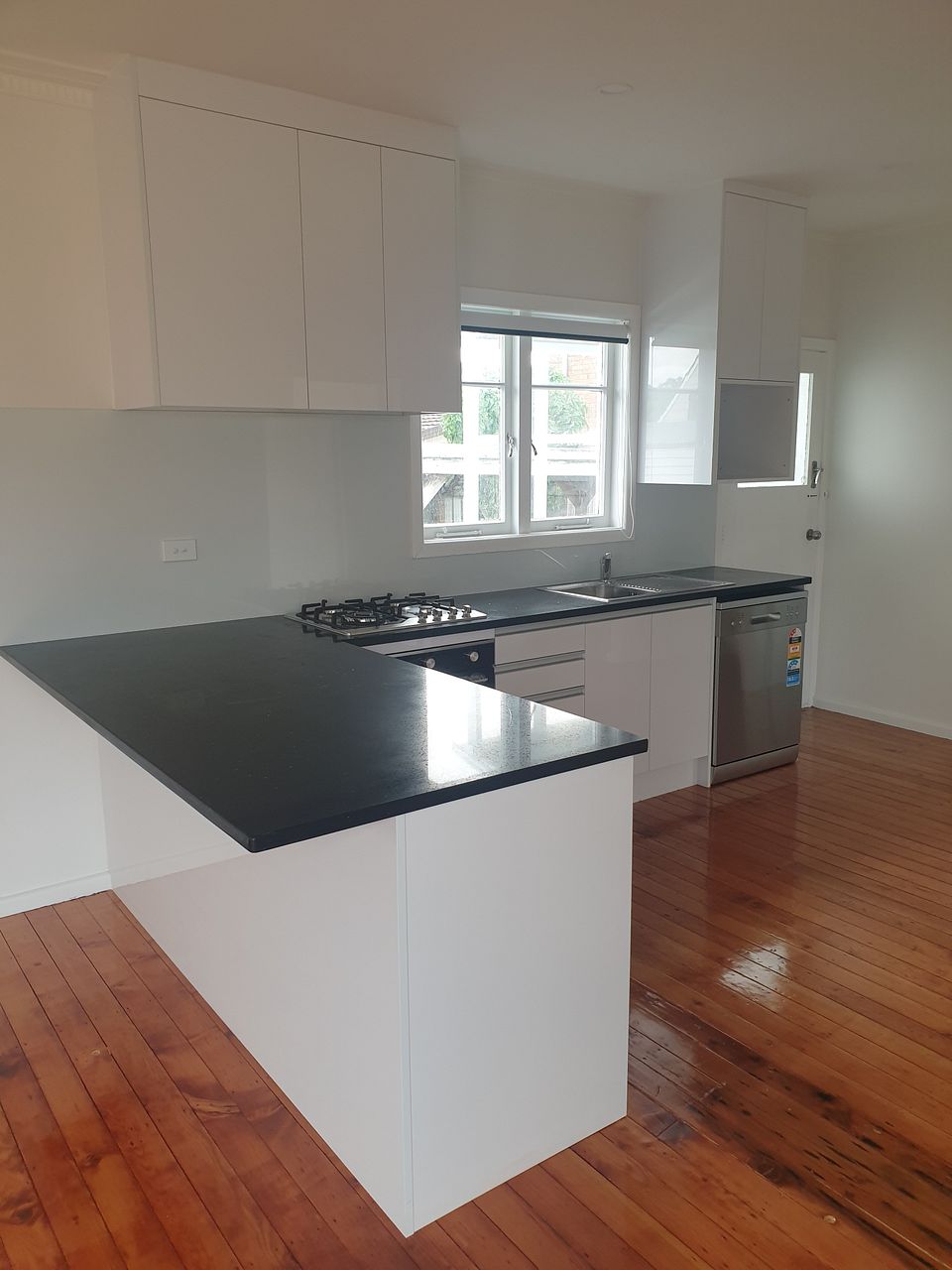 Modern kitchen with stone benchtop, breakfast bar, brand new appliances and INCLUDES brand new front load washing machine.
