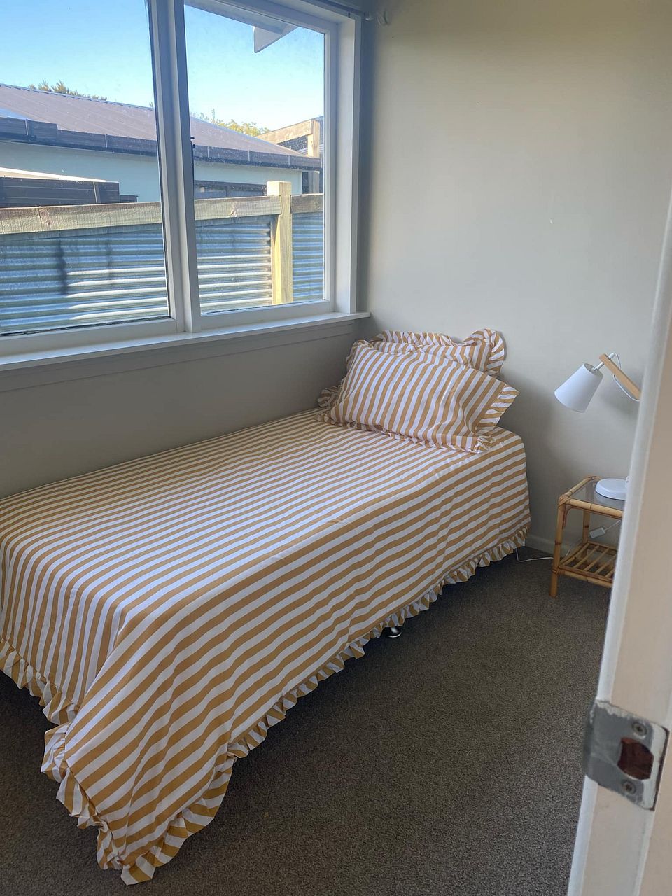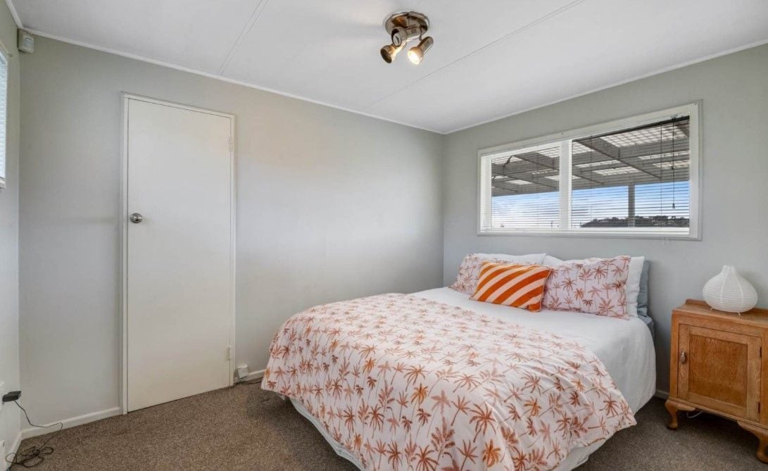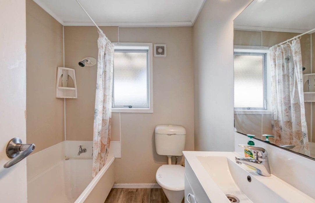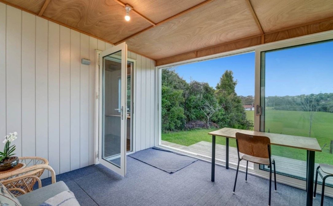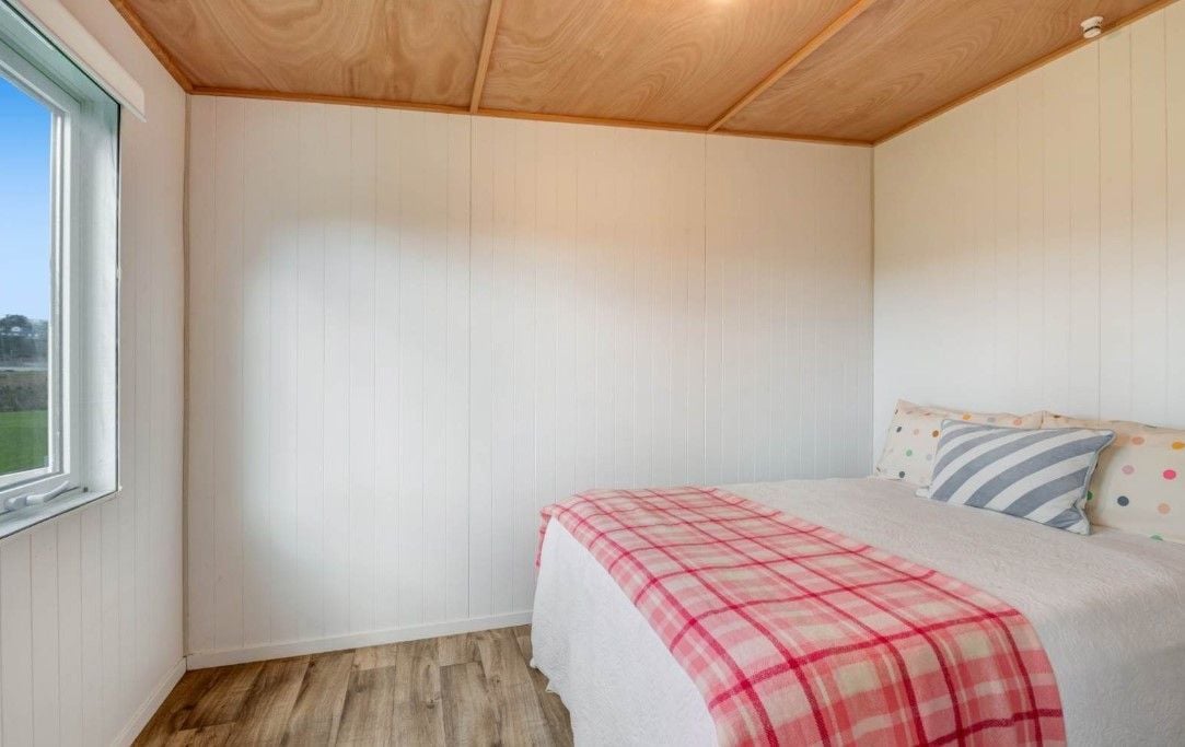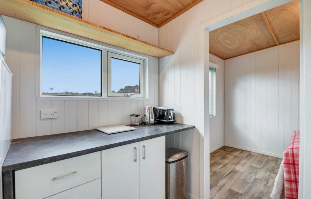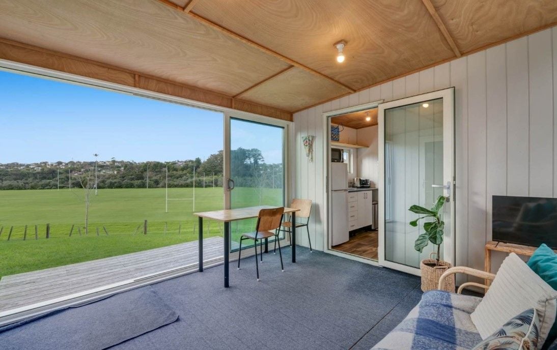 Accessed via stepped pedestrian pathway to the back of the site. Views over playing fields. 2 bedrooms (fits double beds or singles). 1 bathroom with shower and laundry tub. 1 area with bench top and fridge. 'Outdoor room' sitting area with stacker sliders. Uncovered deck and level lawn.