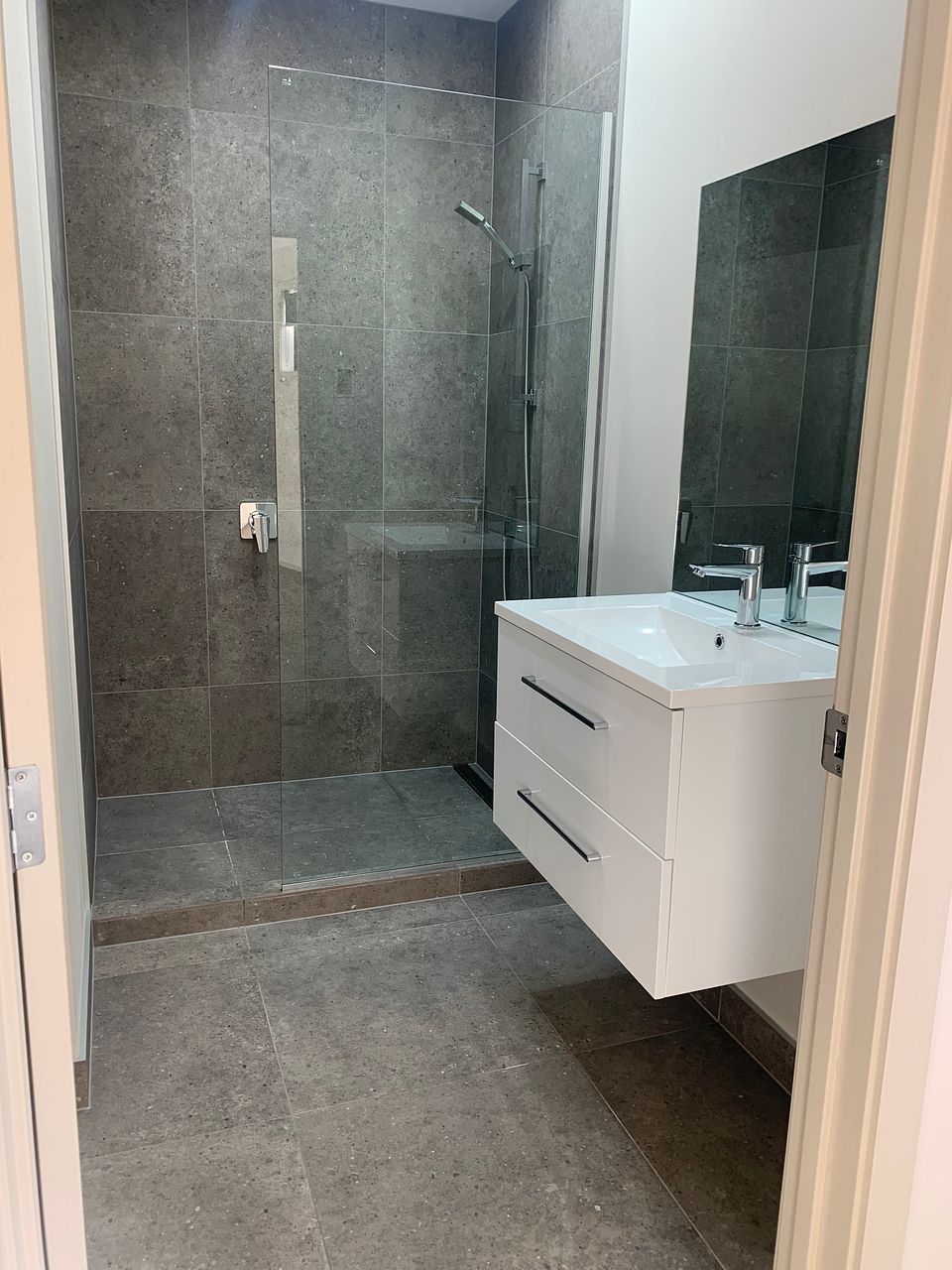 With two spacious bedrooms, each comes with built-in wardrobes and ensuites. Both ensuites have under-floor heating. There is a separate guest toilet. European style laundry is housed in the hallway which includes a washtub and space for a washing machine and drier if stackable.