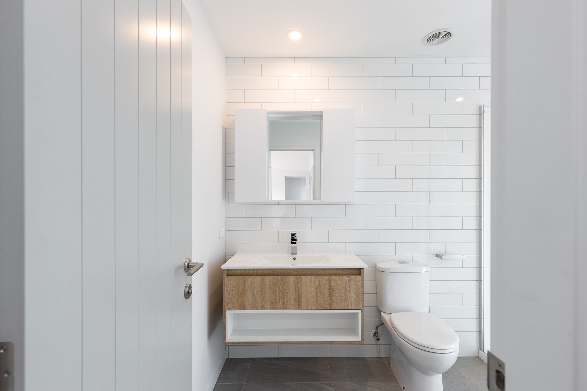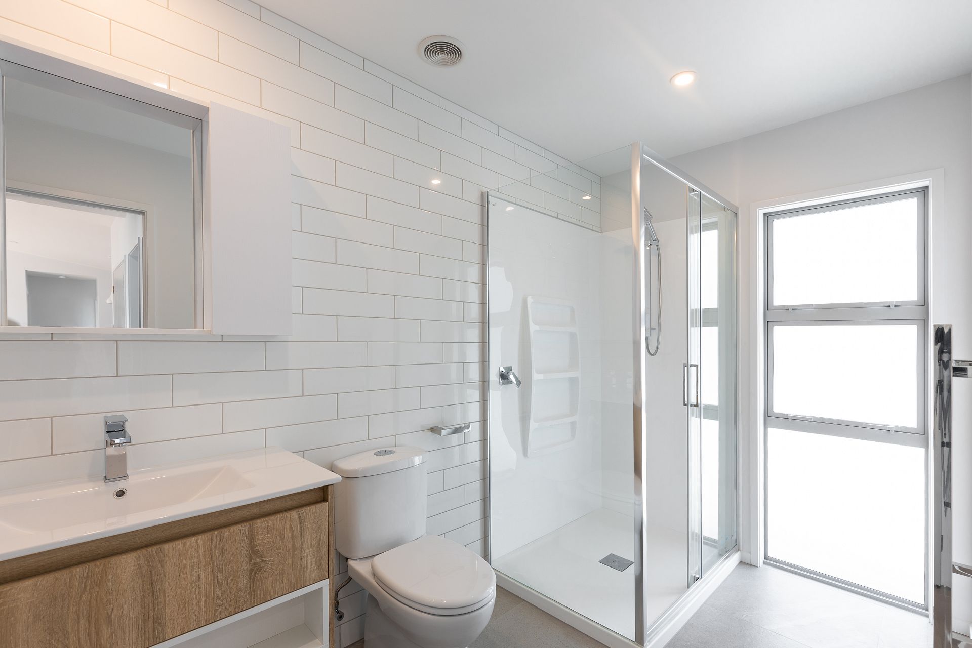 One bathroom with large shower and heated towel rail and toilet