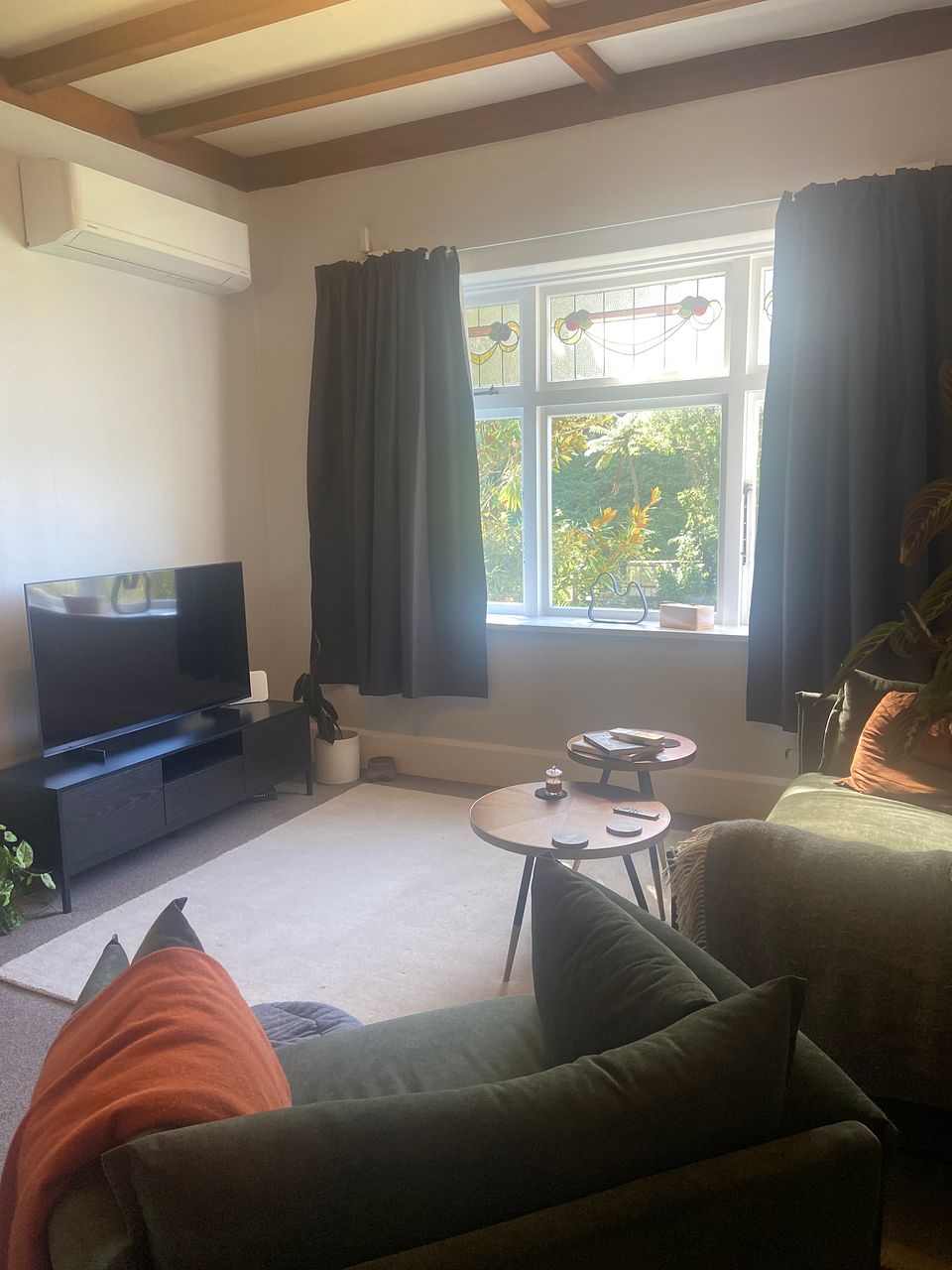 Comes with the heat pump and a heater in the room. There is also a huge fridge included, a washing machine and dryer. It is unfurnished.