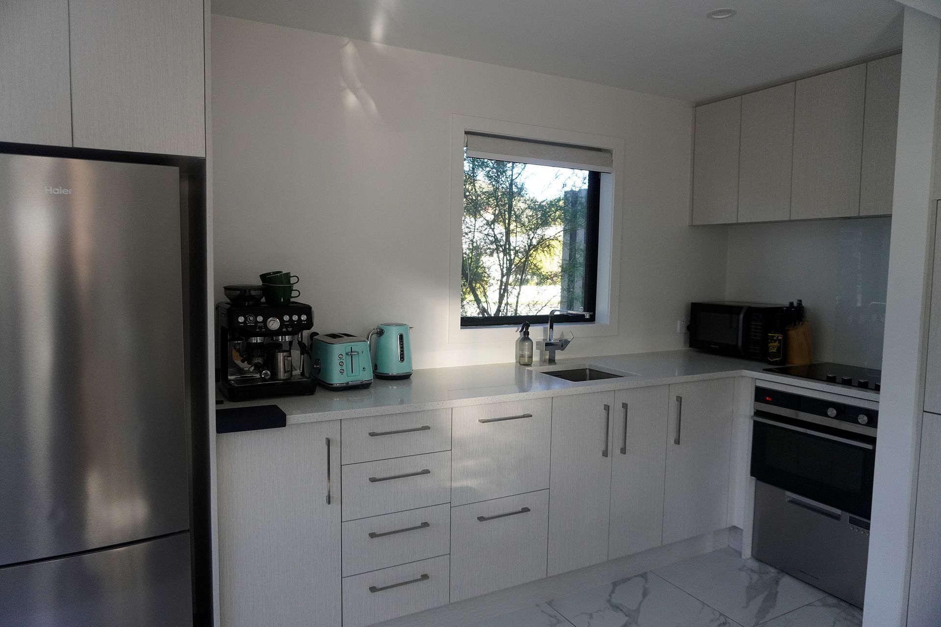 The kitchen features Fisher & Paykel cooktop, oven, dishwasher and washer/dryer combo, with lots of storage. It also comes with a fridge provided.