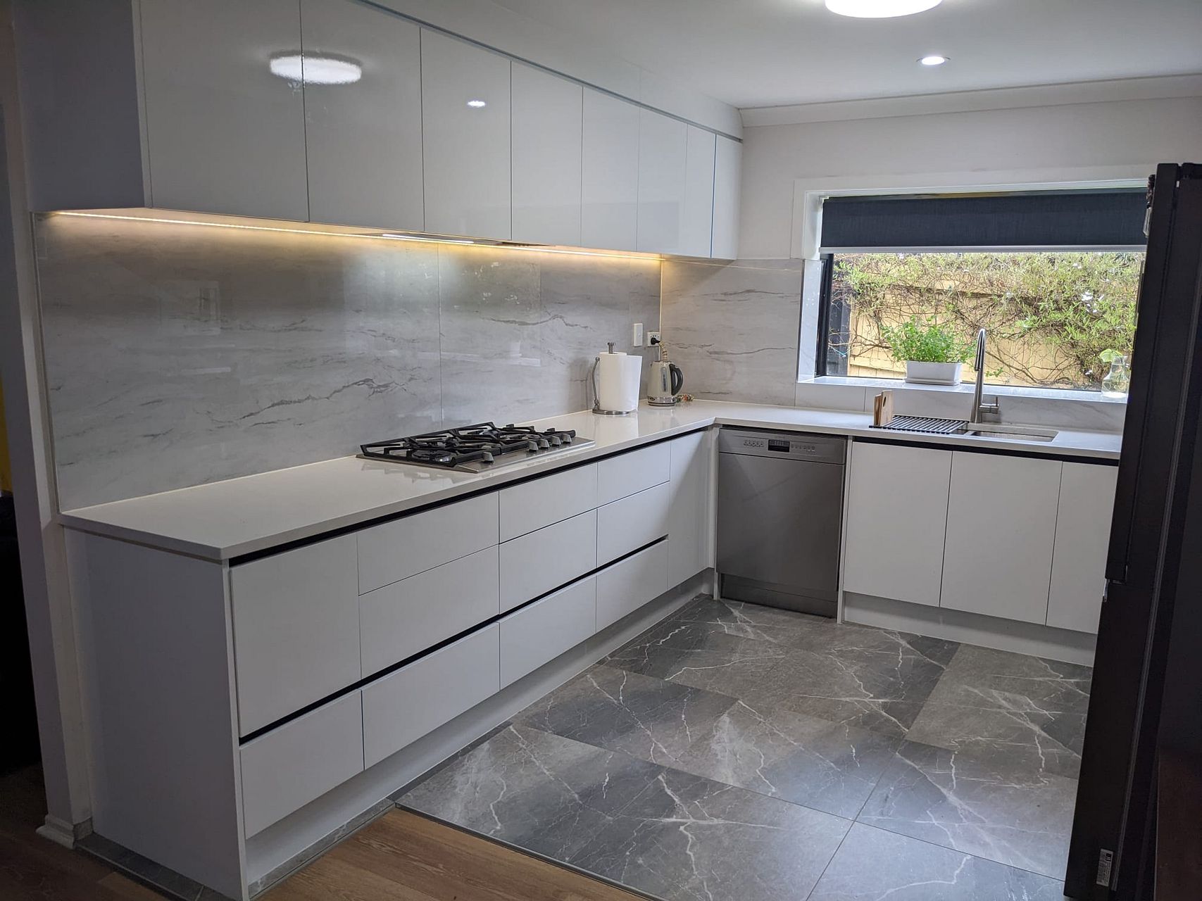 Laminate flooring in bedroom and living areas, tiled kitchen and fully tiled bathrooms.