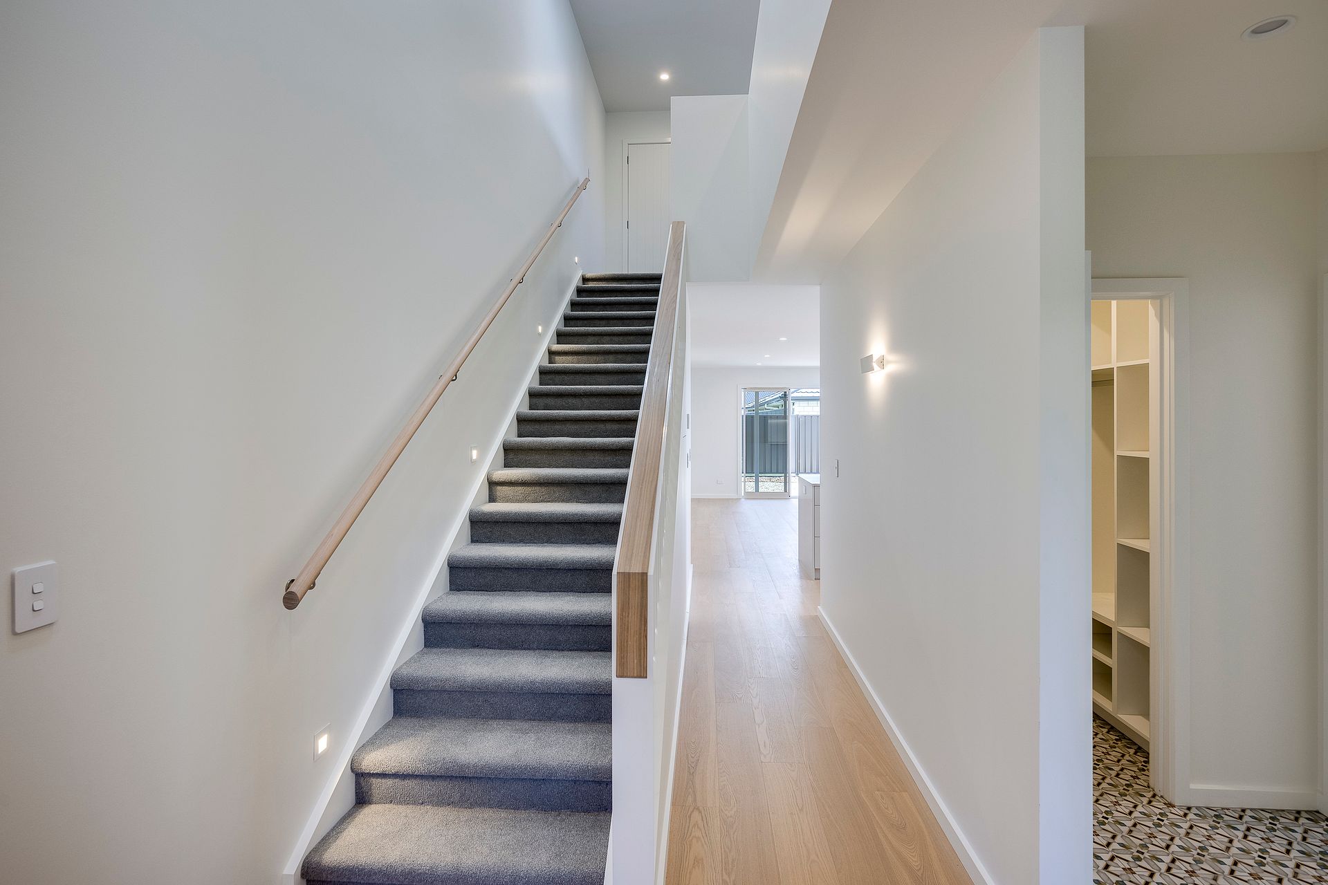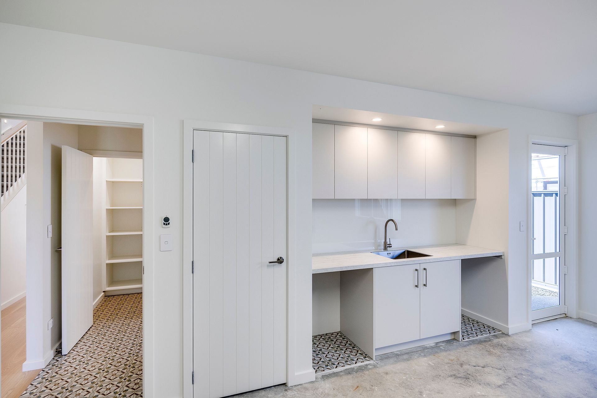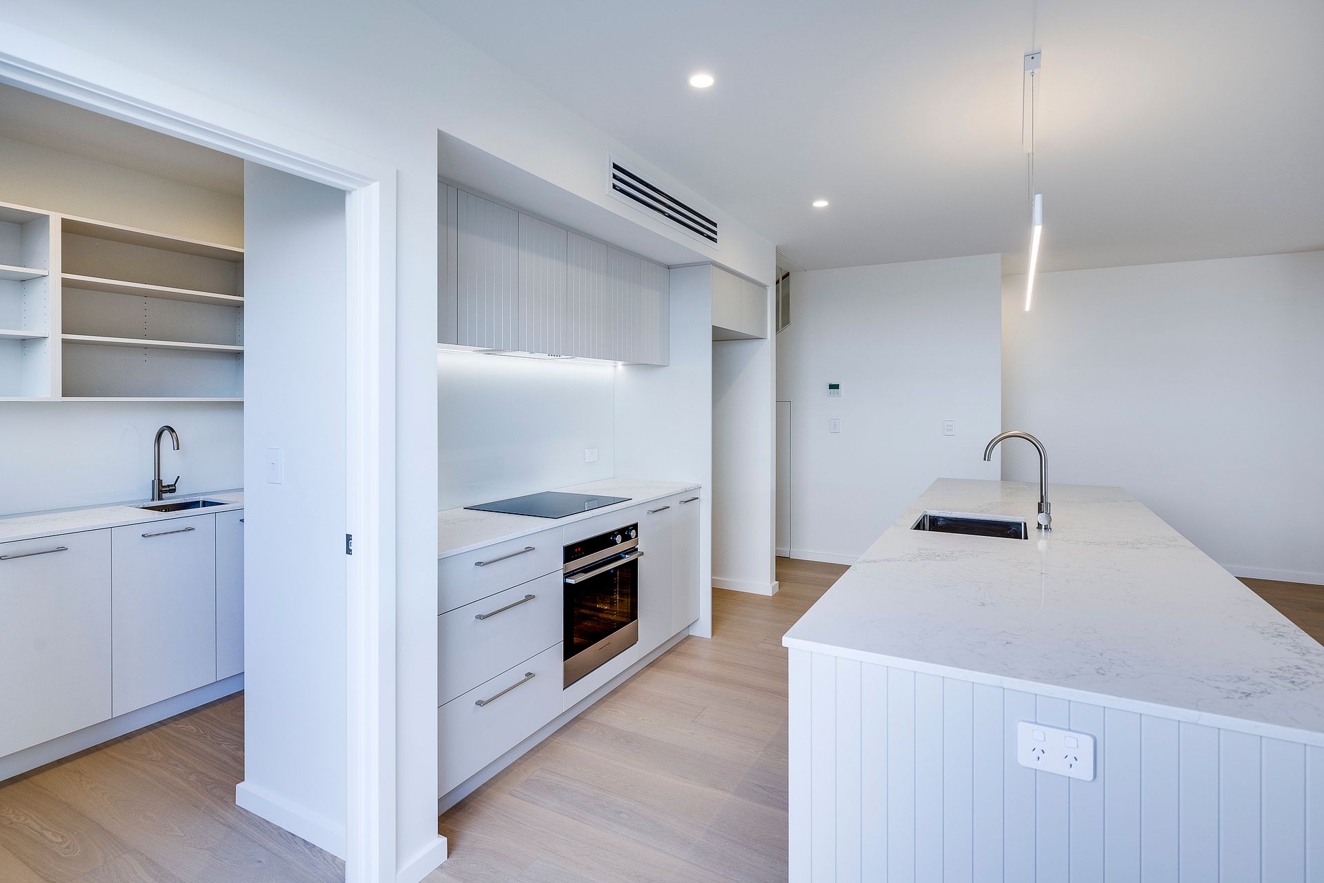 The kitchen includes stone benchtops, walk-in scullery, dishwasher and an induction hob. The downstairs living space flows out onto a sheltered north facing patio and low maintenance garden.