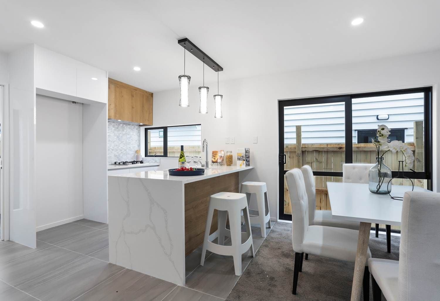 • Open-plan kitchen, dining, and living area