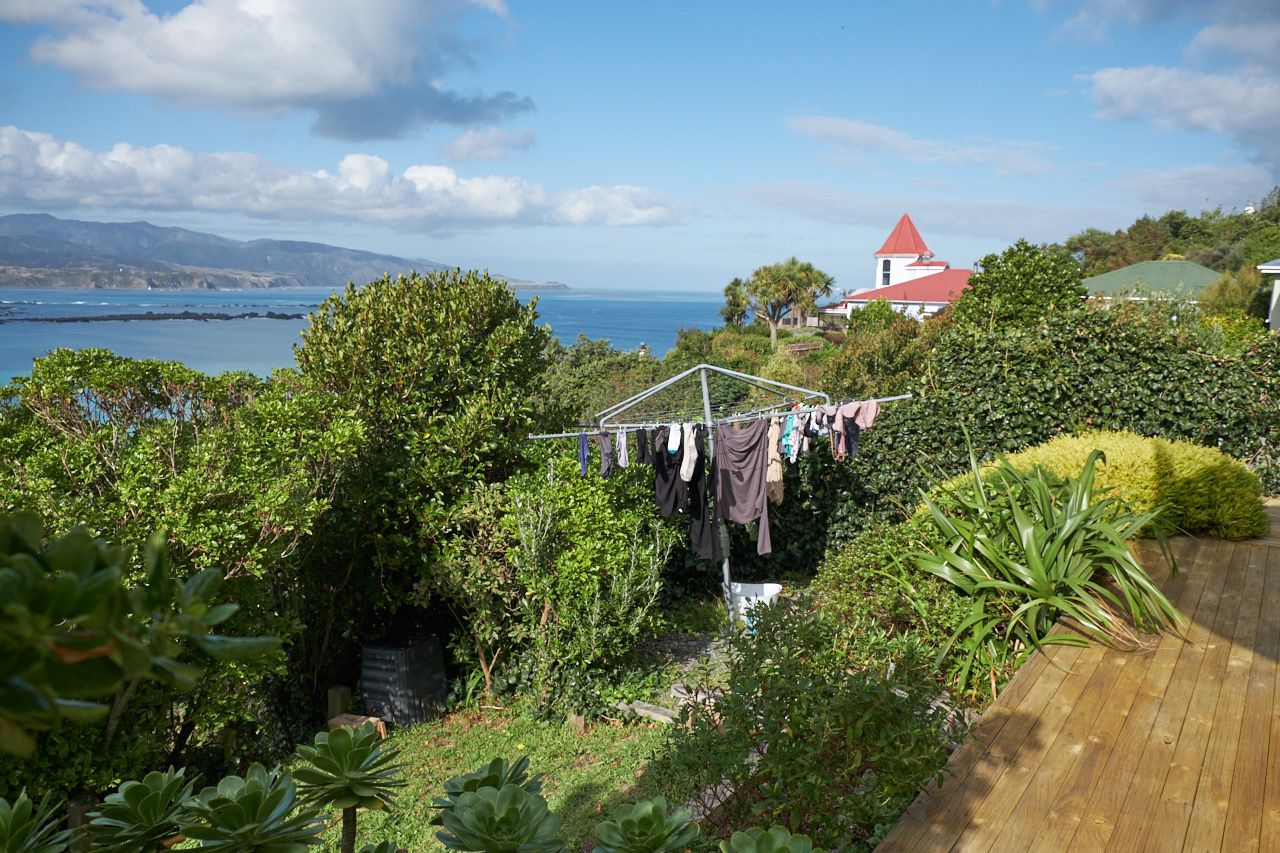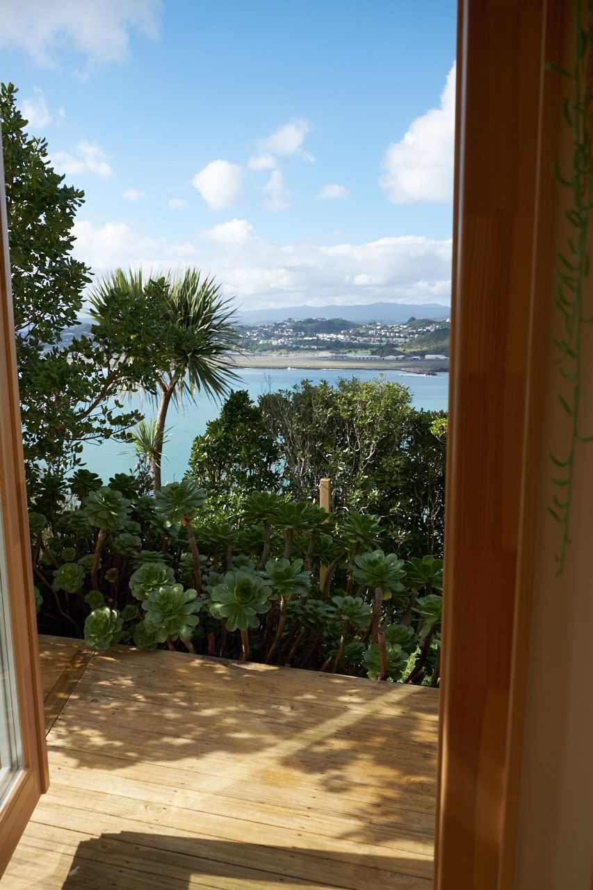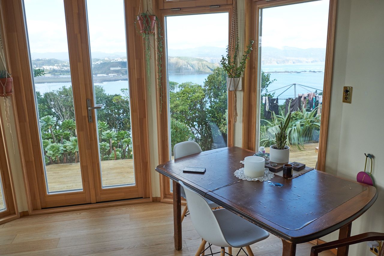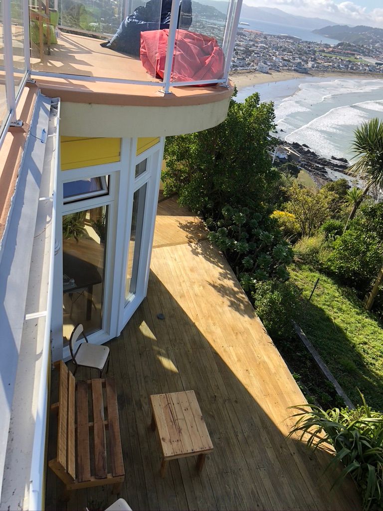 It's the downstairs part of a two storey house with separate garage and entrance. Close to the city, overlooking the open sea. Opens to dramatic views over Lyall Bay, Evans Bay and the Tasman Sea. Having breakfast while watching dolphins does happen.