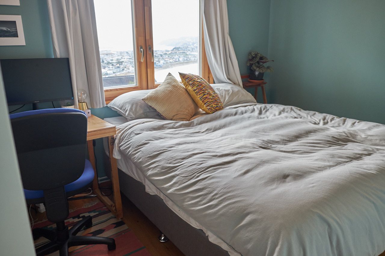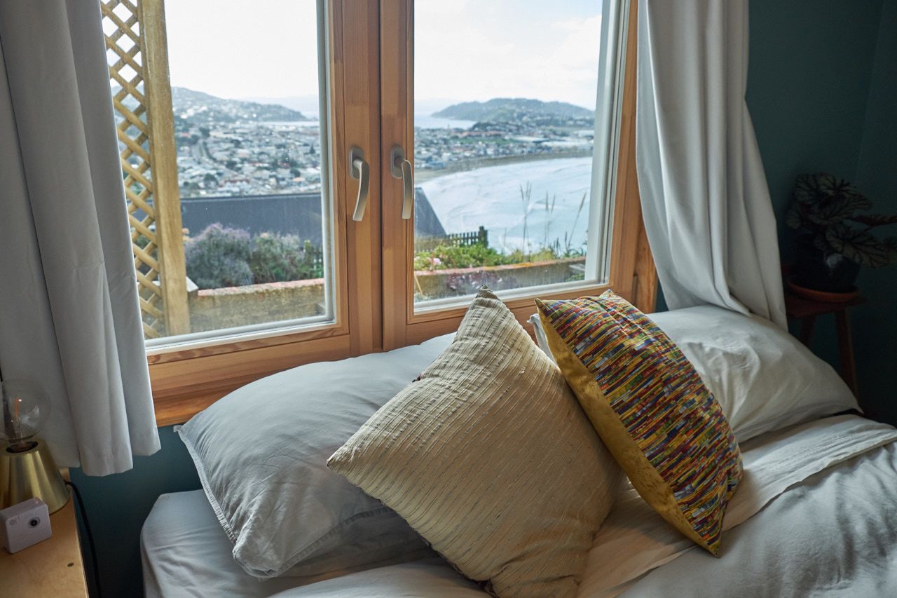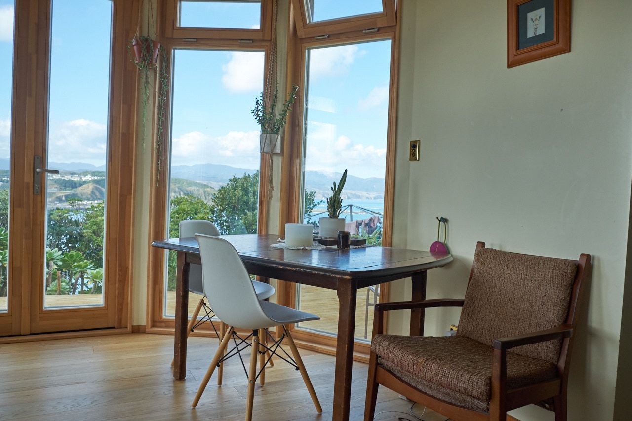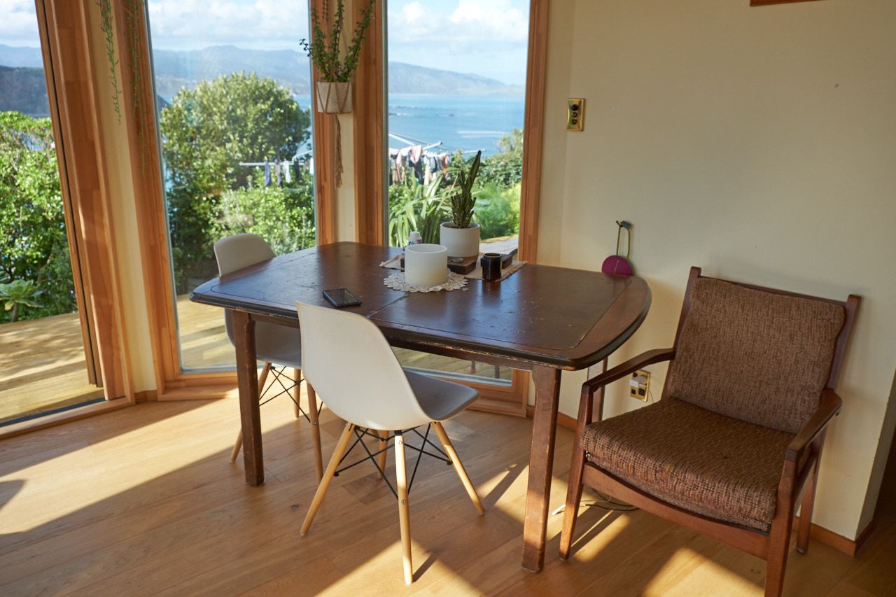 It's the downstairs part of a two storey house with separate garage and entrance. Close to the city, overlooking the open sea. Opens to dramatic views over Lyall Bay, Evans Bay and the Tasman Sea. Having breakfast while watching dolphins does happen.