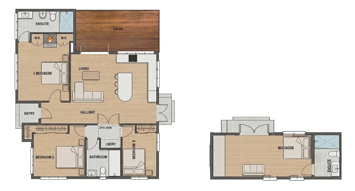 Main House: 3 bedrooms and 2 high-spec bathrooms (including a bathtub). Freshly renovated, fully insulated, double-glazed, and fitted with a heat pump.
