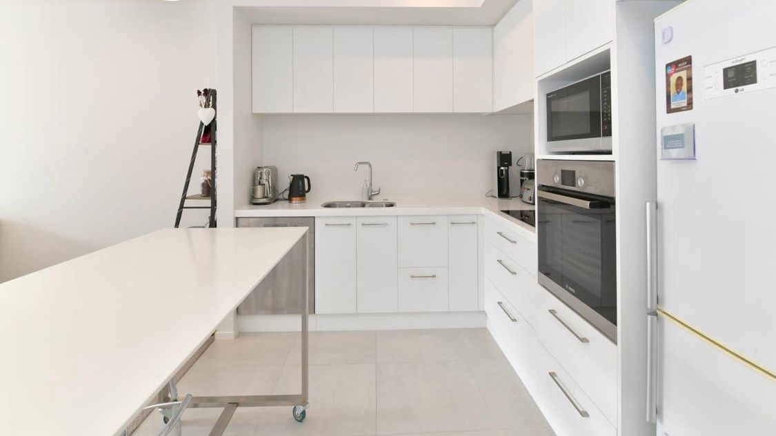 The unit is non-furnished, but includes a moveable kitchen bench which can be used for dining too.
