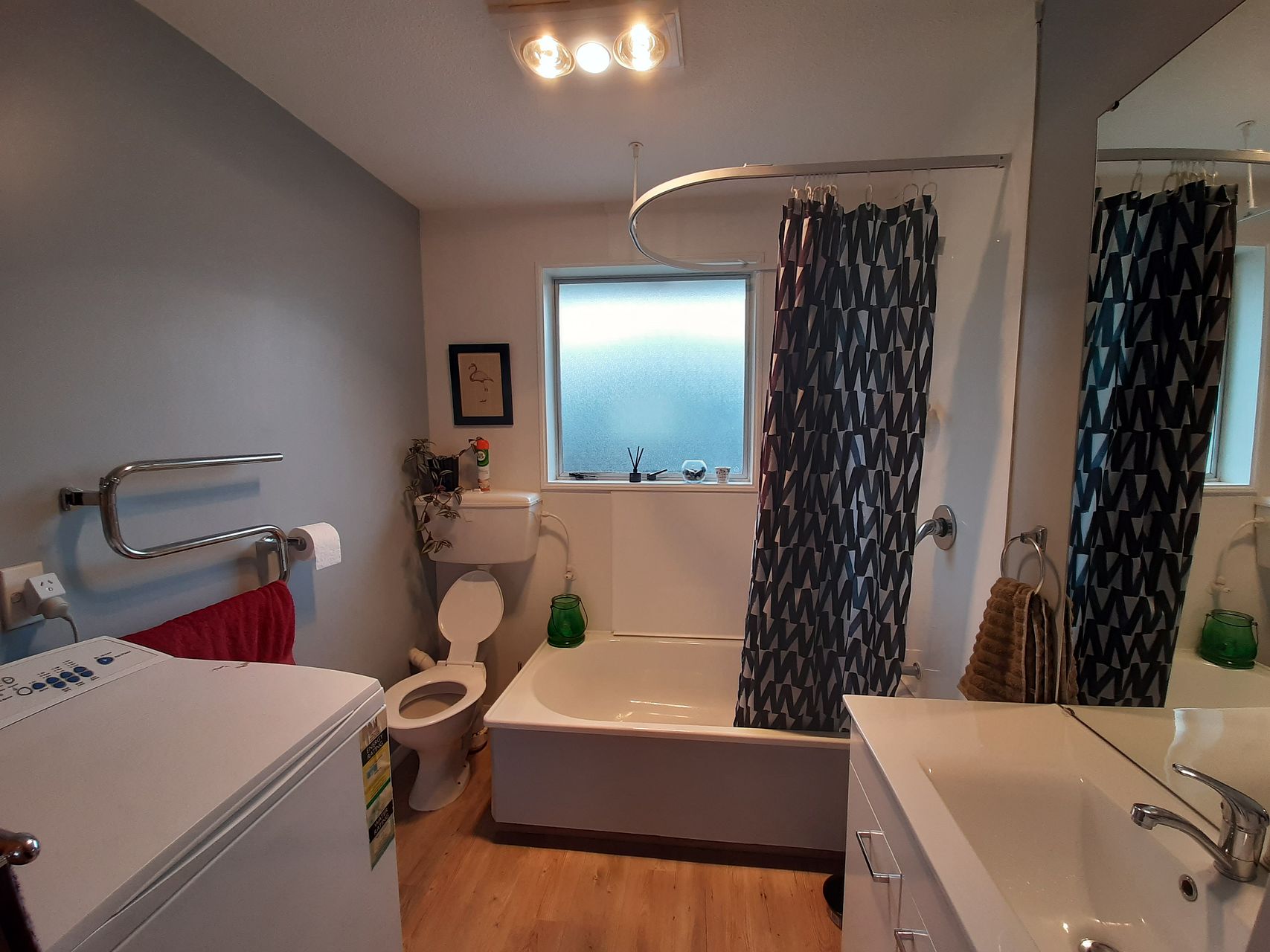 -Modern bathroom with shower over bath, toilet, vanity and large mirror. Laundry facilities are also located here with a new heat/light/fan.