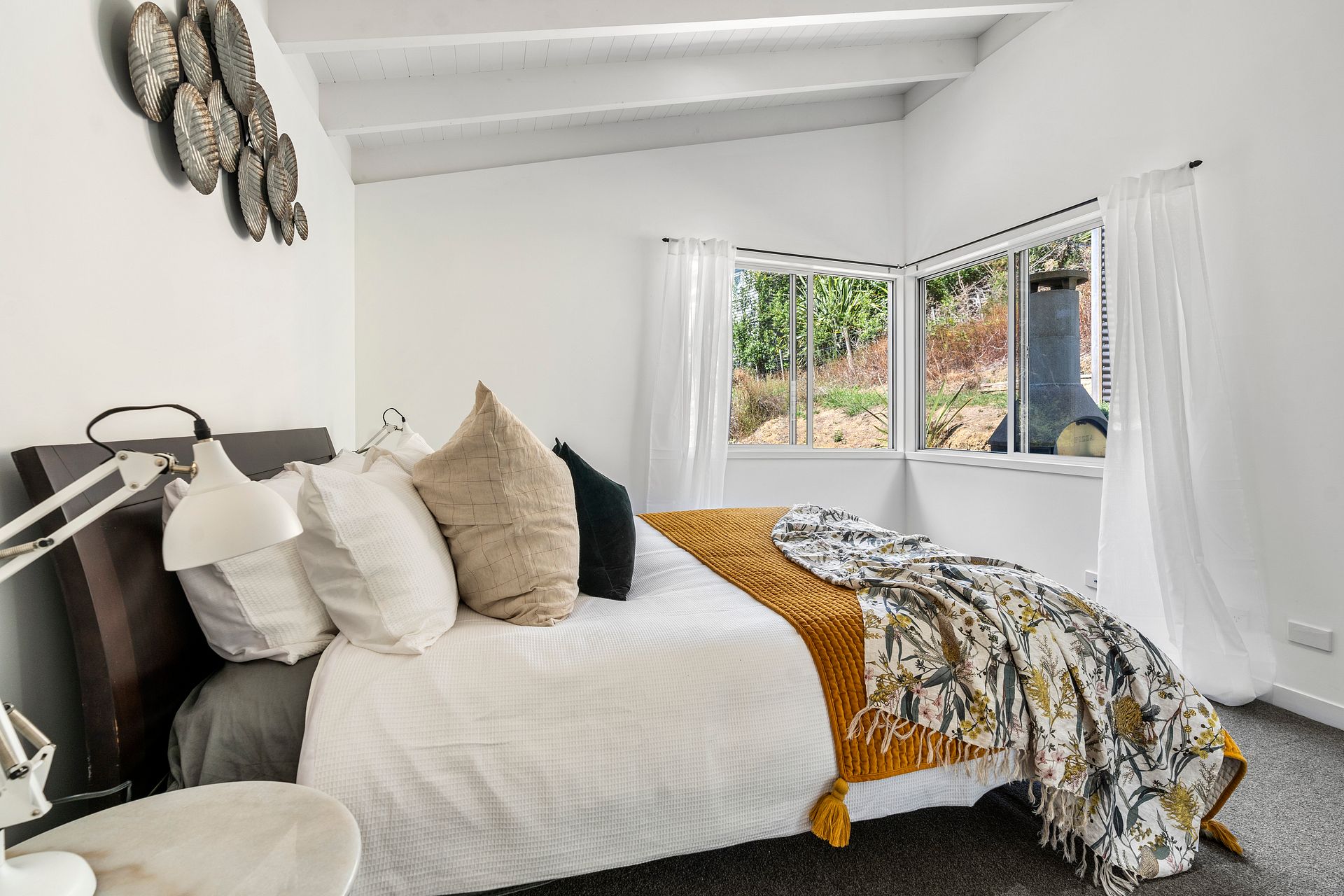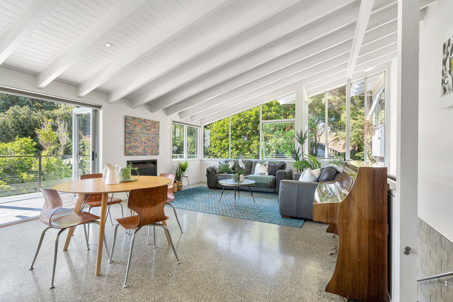 The open-plan layout, floor to ceiling windows and seamless blending of indoor and outdoor spaces are drenched in all day sun. Light, bright and spacious. The elegant design of this home with vaulted ceilings, lounge fireplace and outdoor pizza will warm your heart.