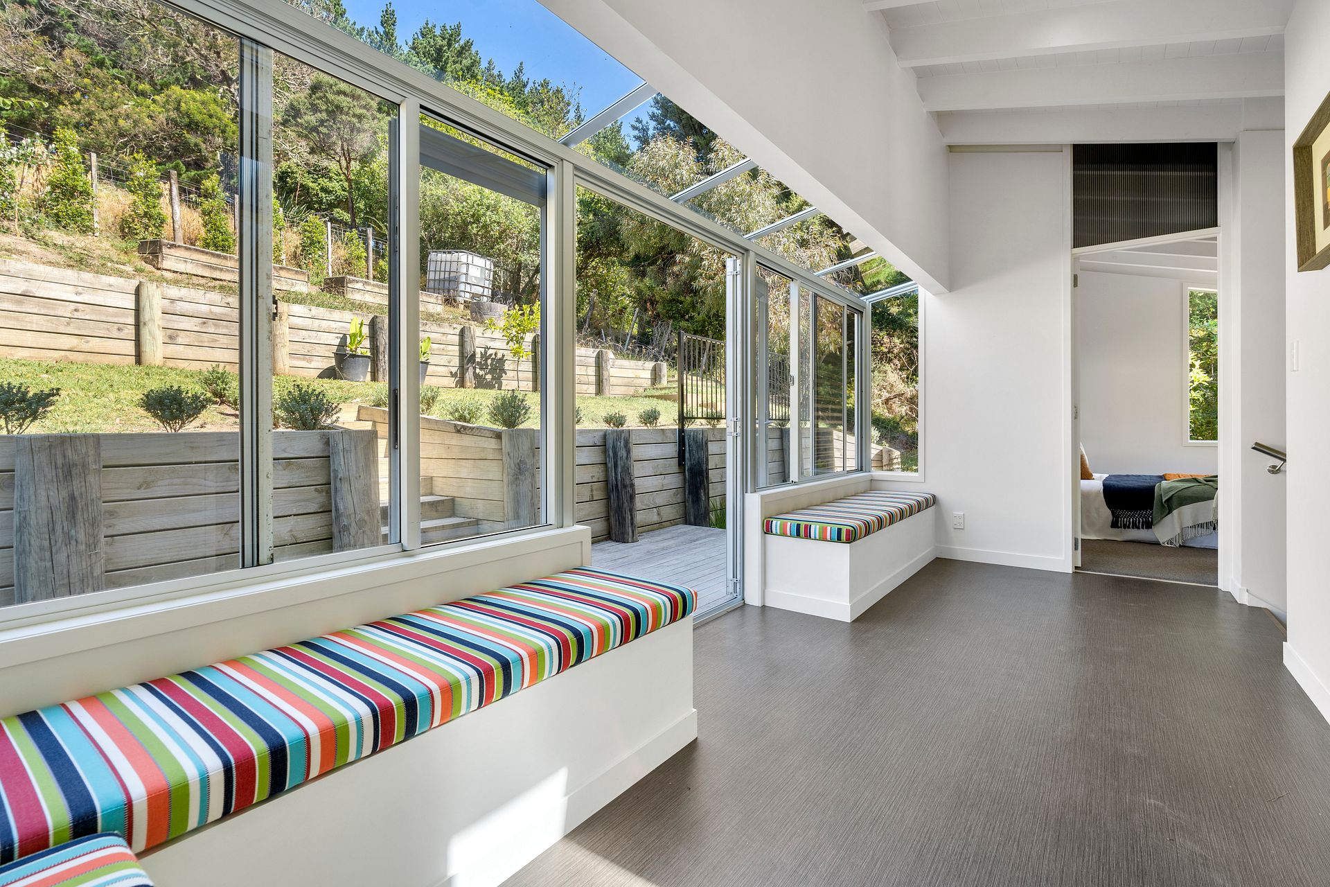 Architectural Masterpiece in Onetangi is a private, peaceful and secluded setting with stunning vineyard & bush views and just a short walk to spectacular Onetangi Beach.