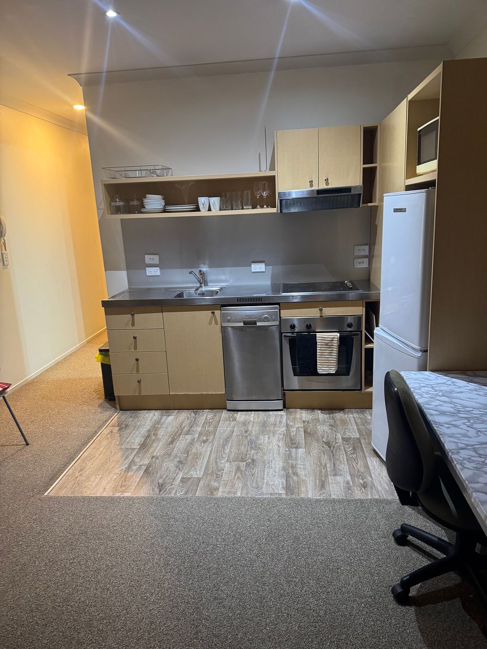 • Full kitchen: fridge, dishwasher, oven, microwave