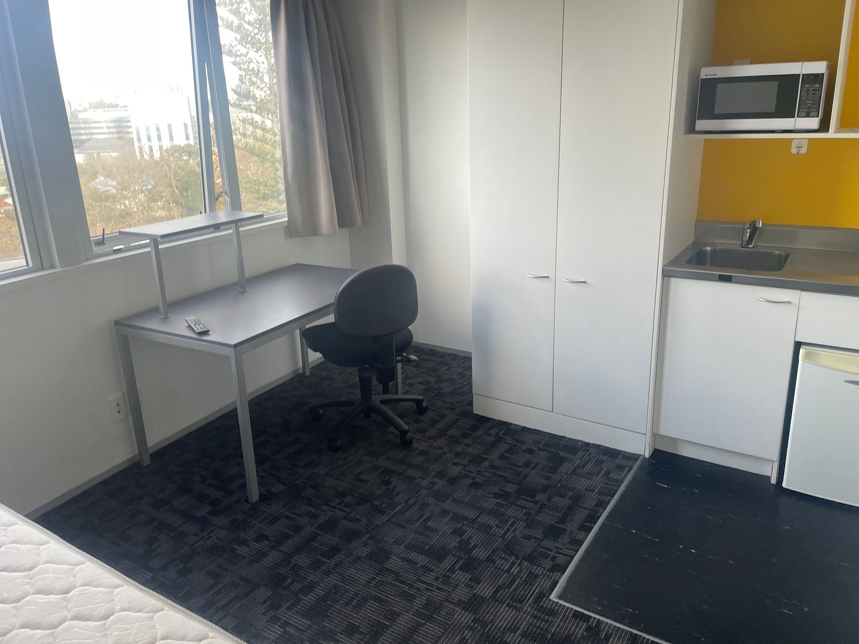 This is a small apartment, best suited for a single person. It currently has a single bed, desk and chair. There may be an option to change the bed to a double, if desired. Need to bring your own linen.