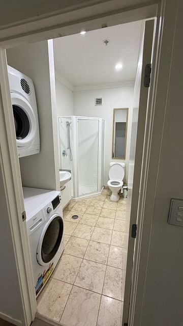 The generously sized bedroom includes a built-in wardrobe with mirrored doors, while the modern bathroom also includes a washing machine and dryer for convenience.
