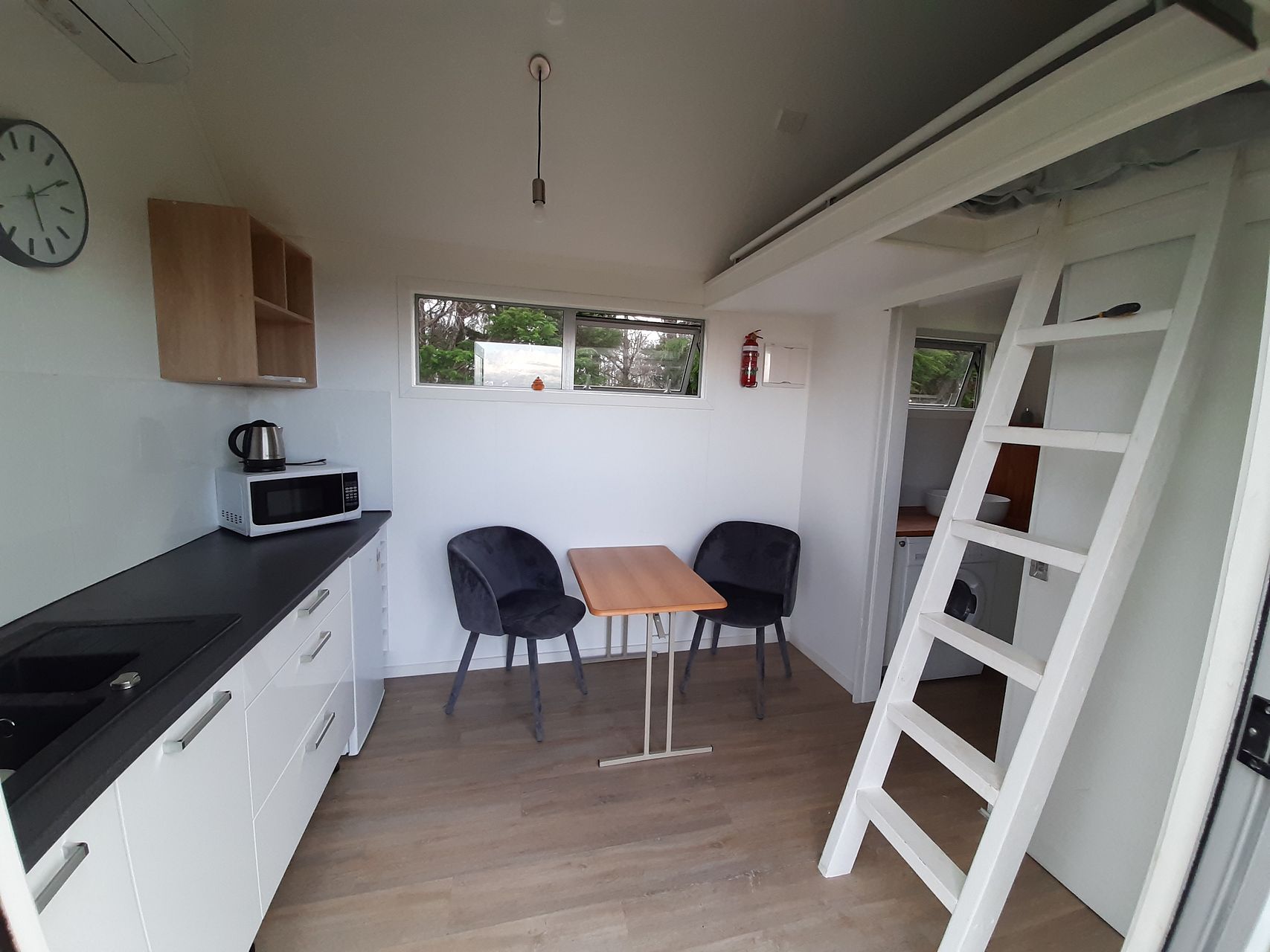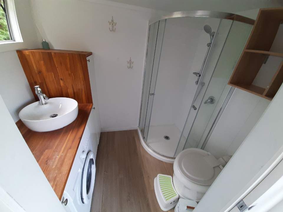 "Keriview" is a fully equipped tiny house overlooking Kerikeri township. It sleeps 2 in the loft, while on the ground floor you'll find the kitchen, dining table and a bathroom with shower and even a washing machine.
