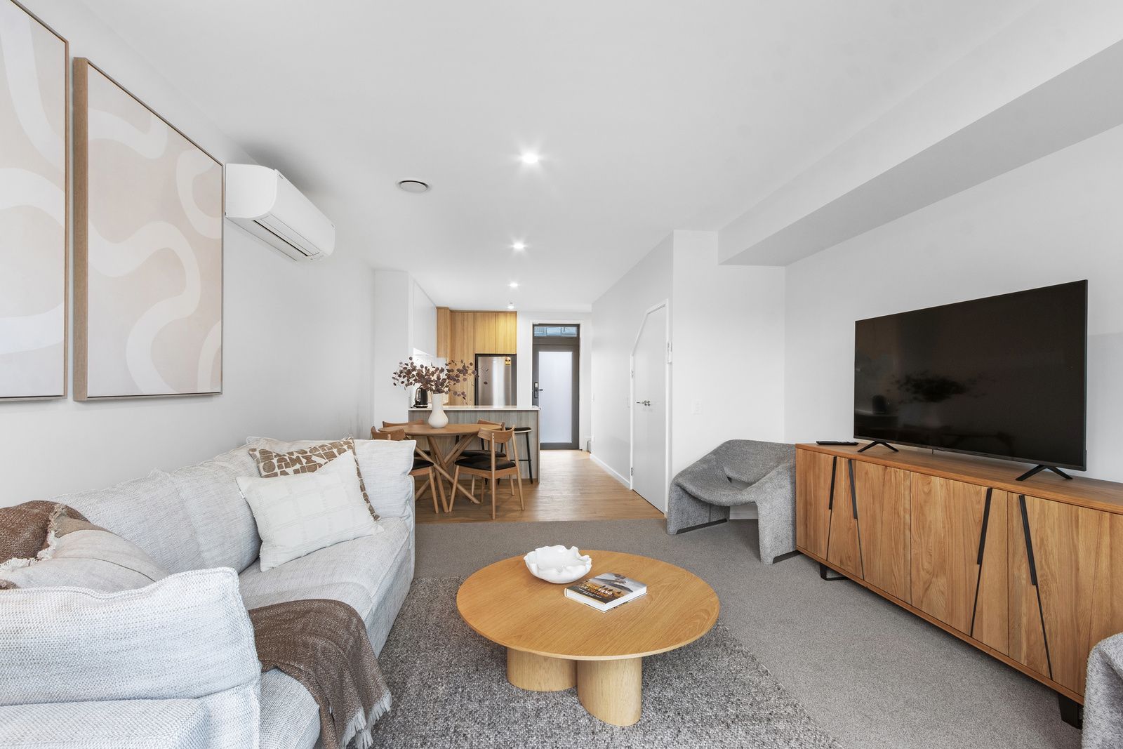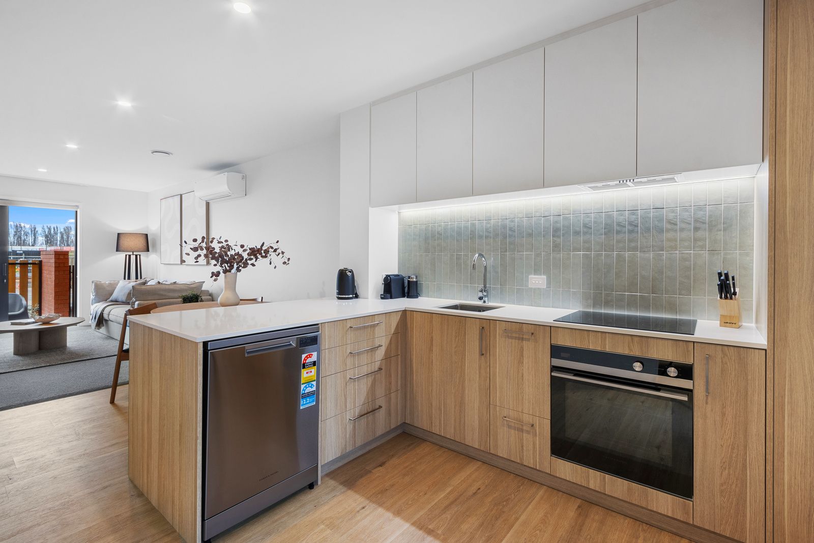 > Open plan kitchen, living and dining areas