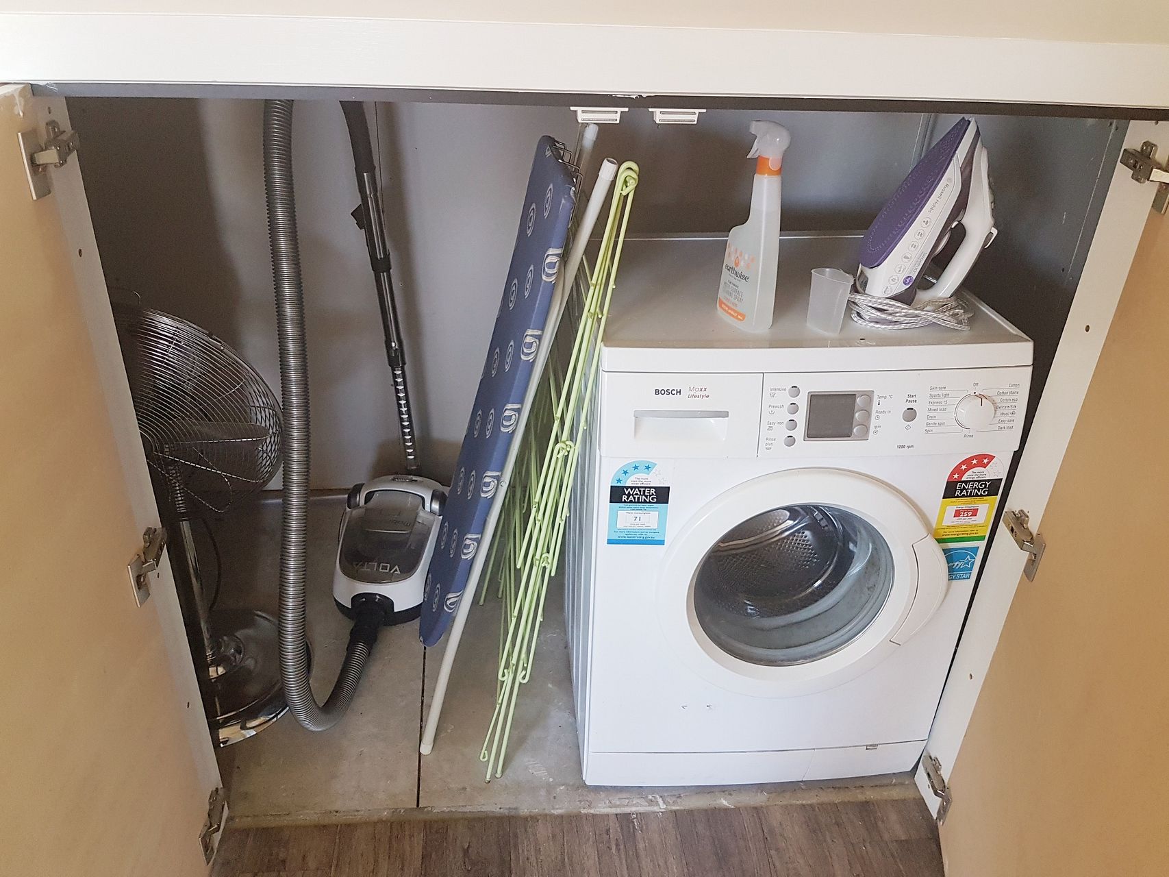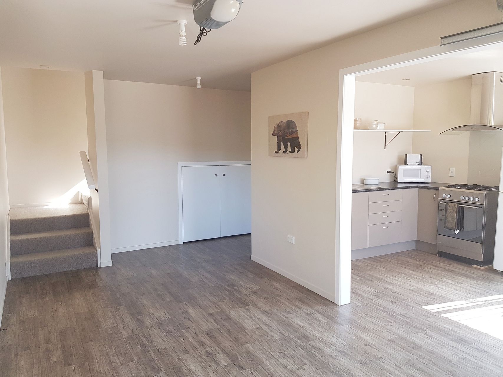 The downstairs has a kitchen/dining area, bathroom, laundry cupboard under the stairs and large spare space. The kitchen has a stove oven with rangehood, a microwave, kettle, toaster, fridge/freezer, dining table, and cutlery/crockery. The bathroom has a sink, toilet, shower and heated towel rail. A washing machine is in the cupboard under the stairs along with a drying rack, iron and small ironing board.
