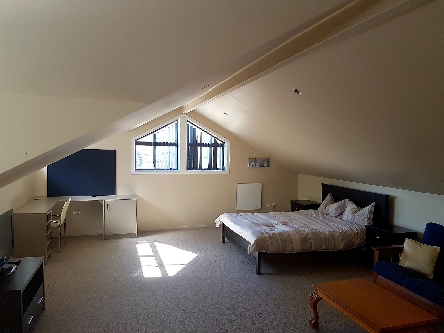Upstairs is one large open room serving as a bedroom, lounge and office. It is furnished with a very comfortable queen bed, matching bedside tables, chest drawers, a desk with pinboard, futon couch (opens as occasional double bed) as well as a coffee table & TV. Unlimited Wifi is included.