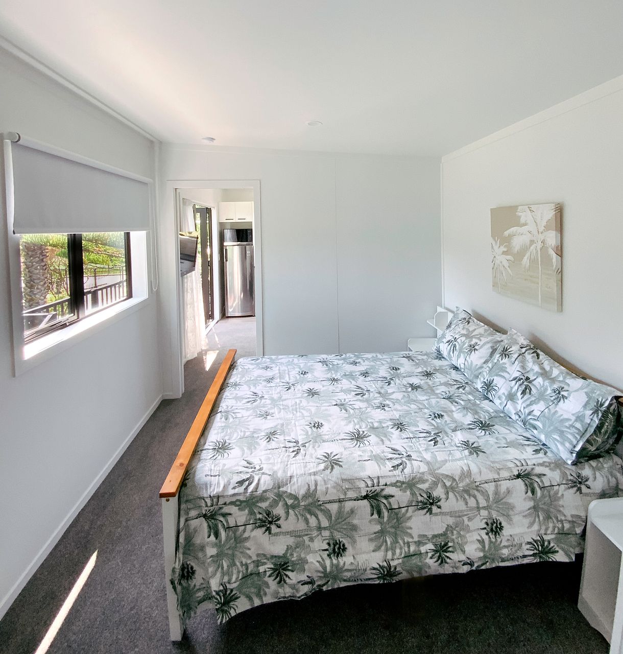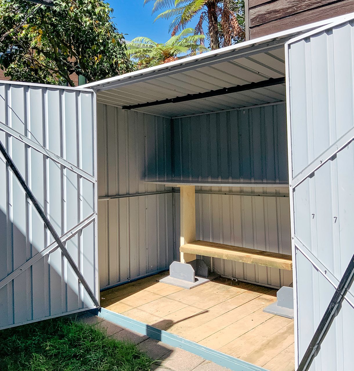 Bedroom includes a bed + new bedding, two mirrors, two wardrobes with drawers + hanging space and two bedside tables for more storage. There’s also an outdoor area to hang washing and a large storage shed available for use.