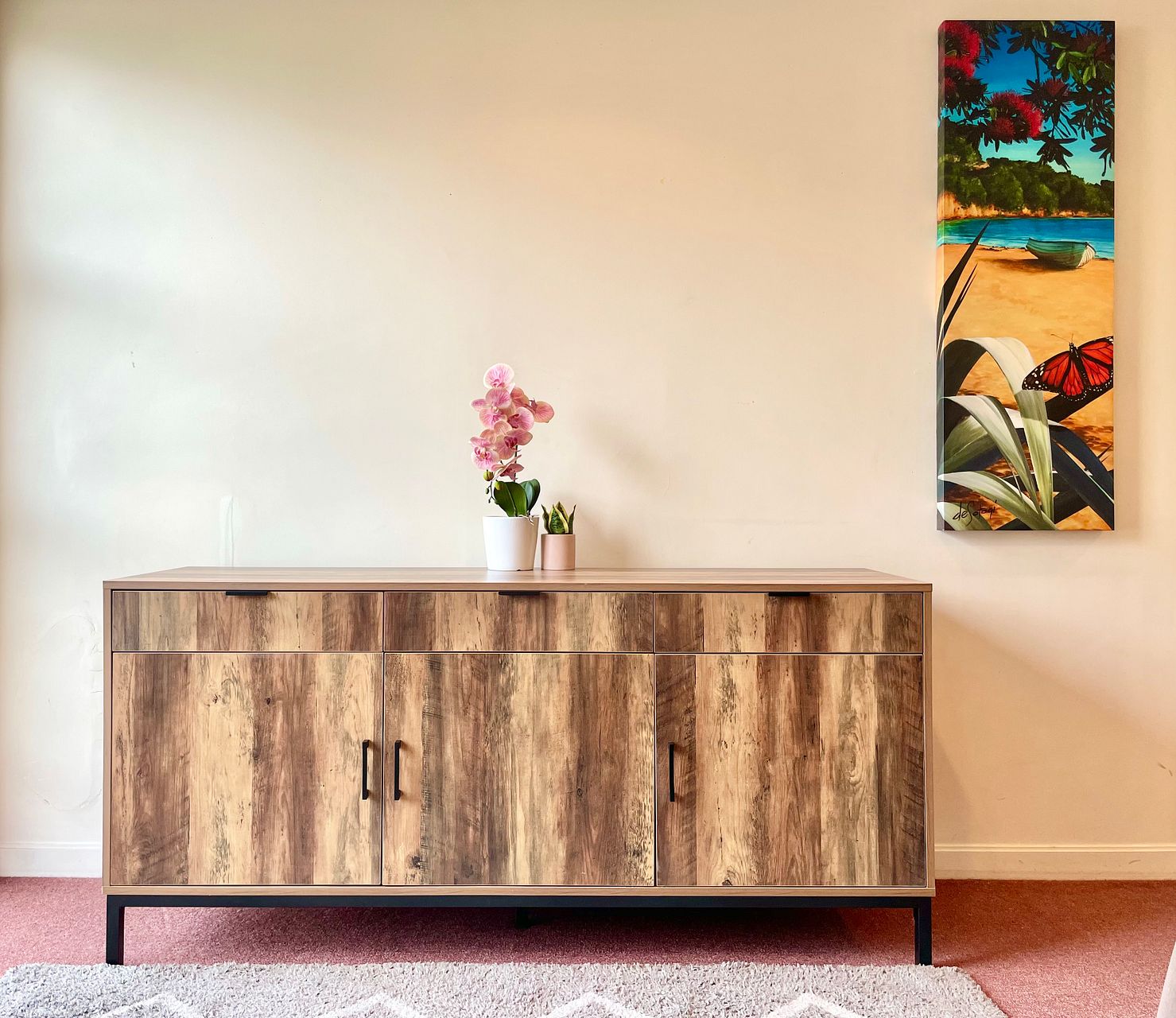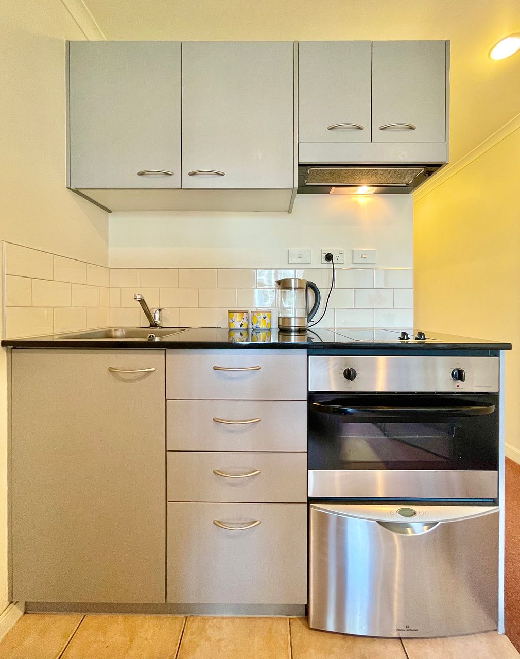 The kitchen is equipped with a full sized fridge, medium oven, twin cooktop, dishwasher drawer and good cabinetry.