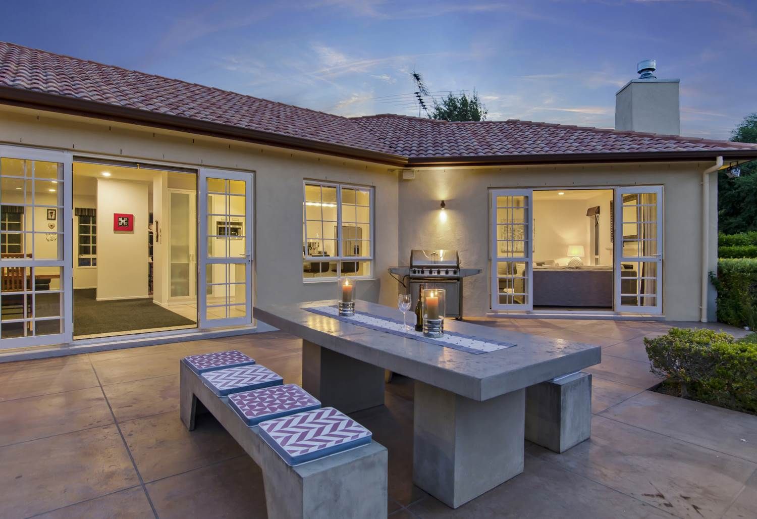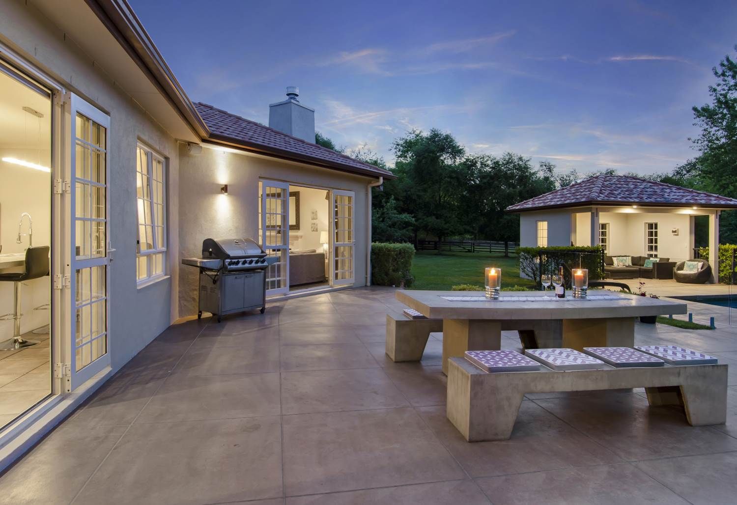 Multiple sets of stackers open to a well-spaced patio completed with large heated pool for year-round use and cabana set among level lawns and lush plantings.