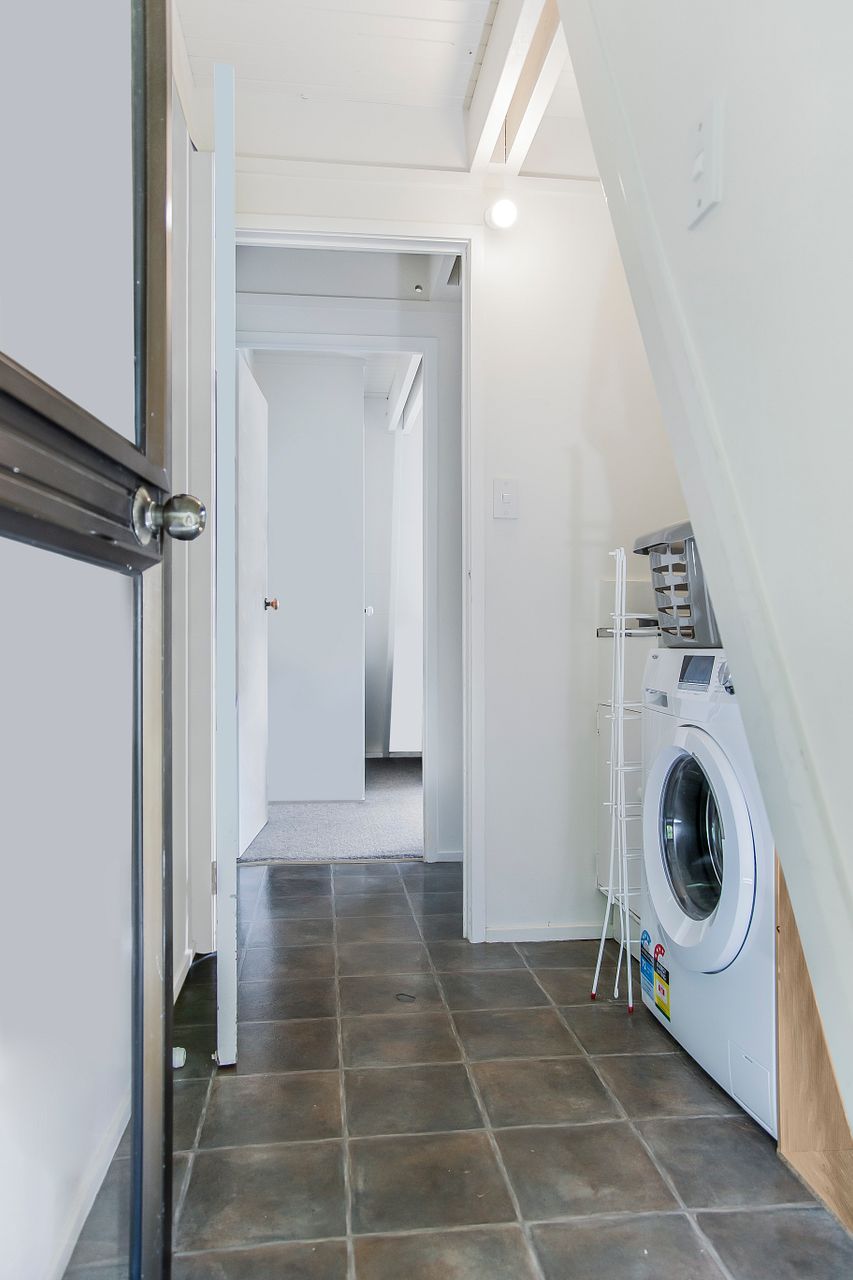 On the first level, there is room to park two vehicles, one under cover. Upon entering the home you will discover a large light filled open planned space comprising kitchen, dining and living that opens out to a sunny, private deck with small courtyard. A lovely spot for relaxing or a BBQ.