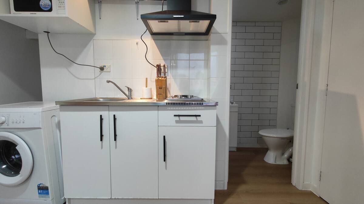 The flat comes equipped with a cooking stove and range hood in a small but functional kitchen space, ensuring meal preparations are a breeze.