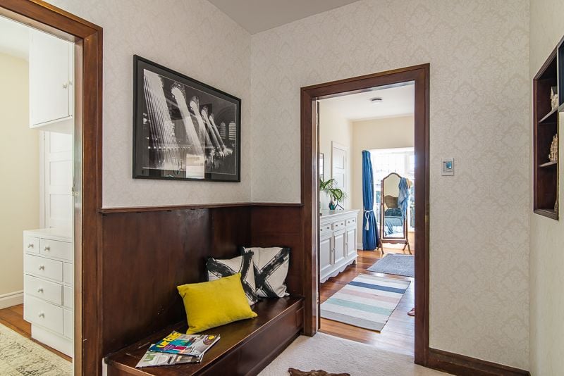The house is divided into two levels: the living level and the bedroom level. There are four bedrooms. One bedroom has an ensuite. The bathroom actually has a bath and a separate shower, and a large vanity. There is also a separate toilet with basin (a powder room) on the living floor.