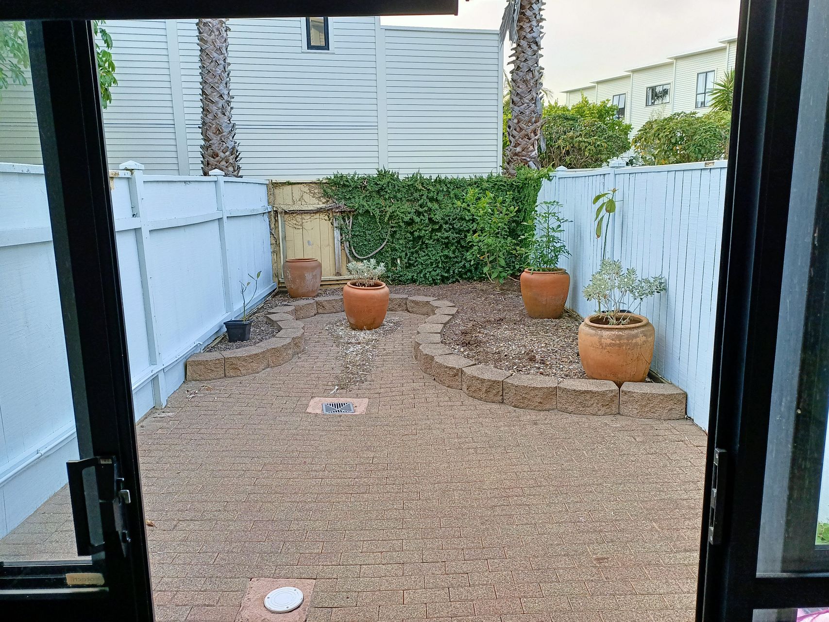 Tidy decorative backyard with flower beds and plant pots – accessible through the ground floor bedroom
