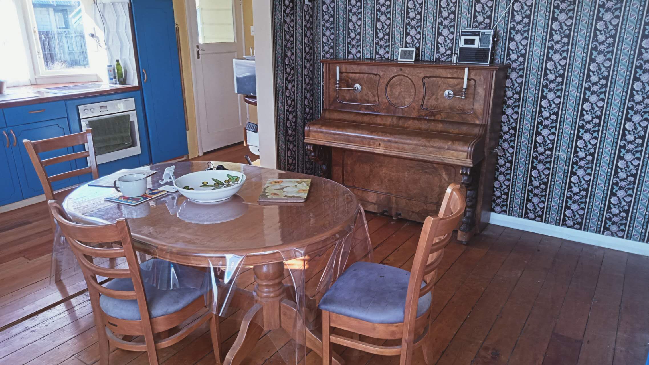 Cottage with charm log burner and piano.