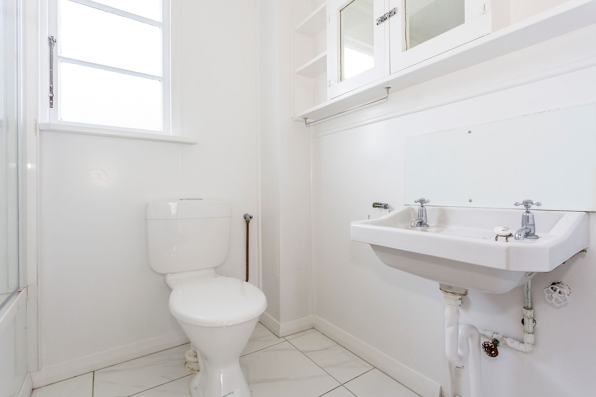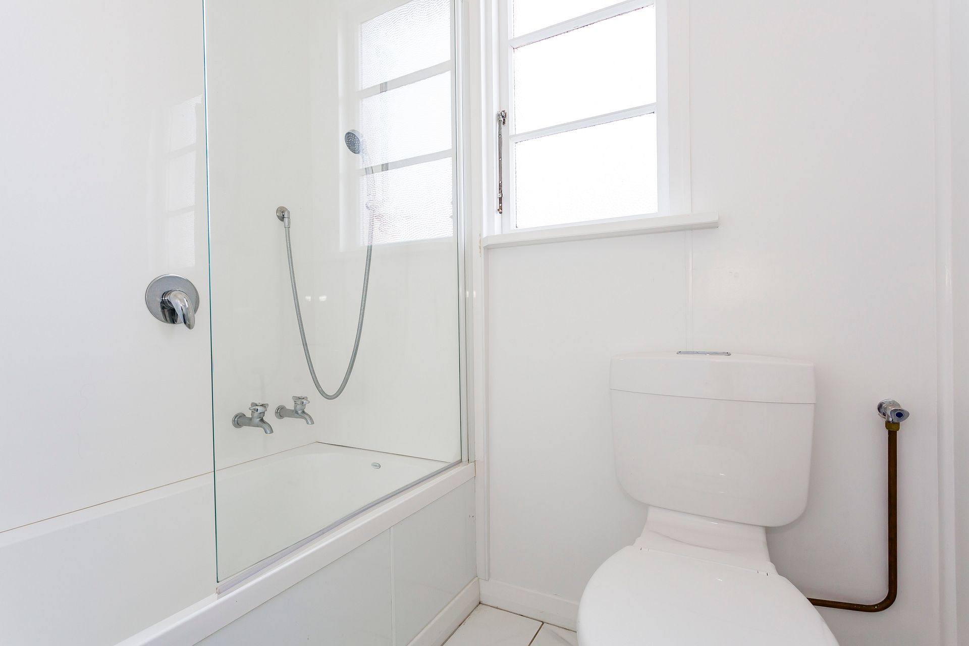 The bathroom has a shower over the bath,