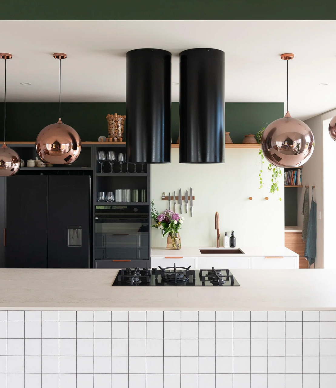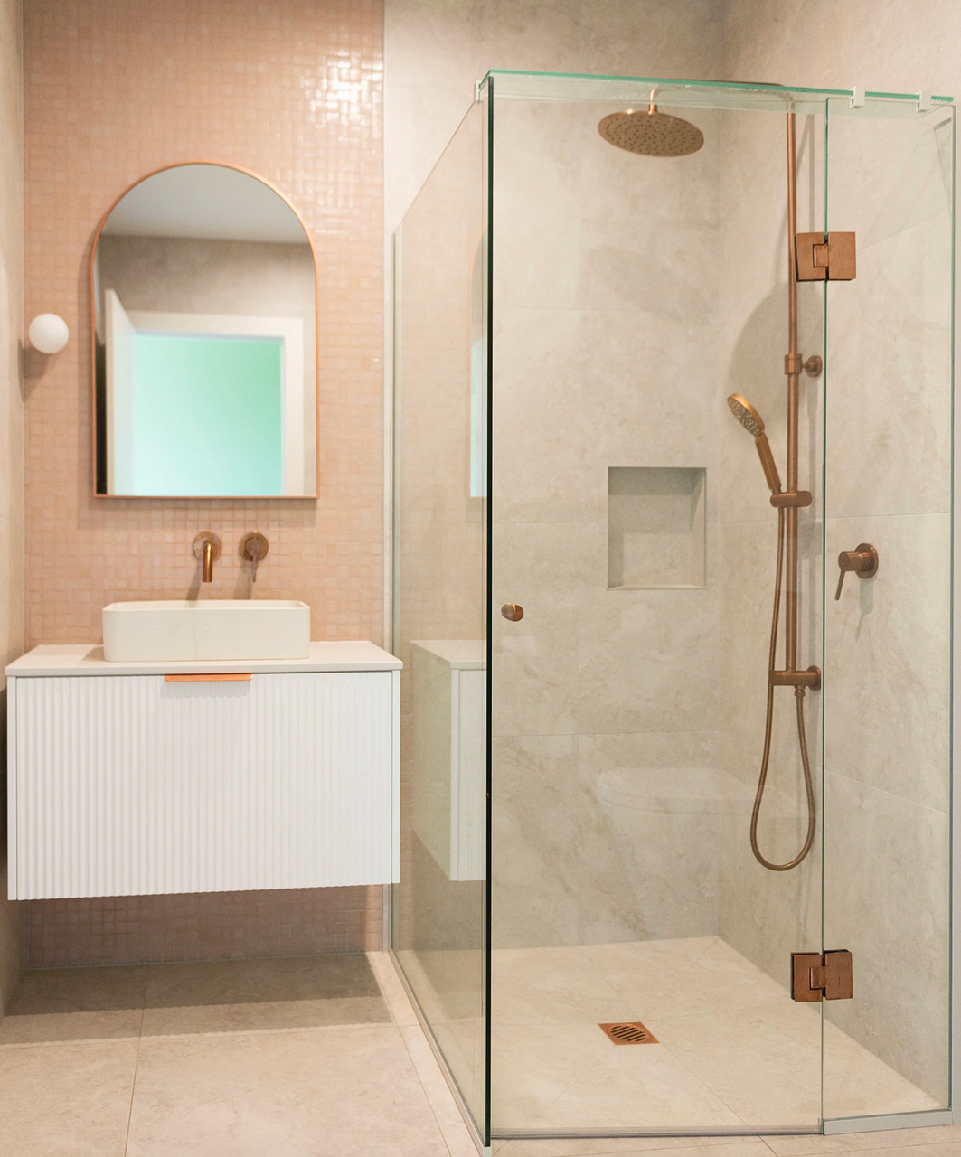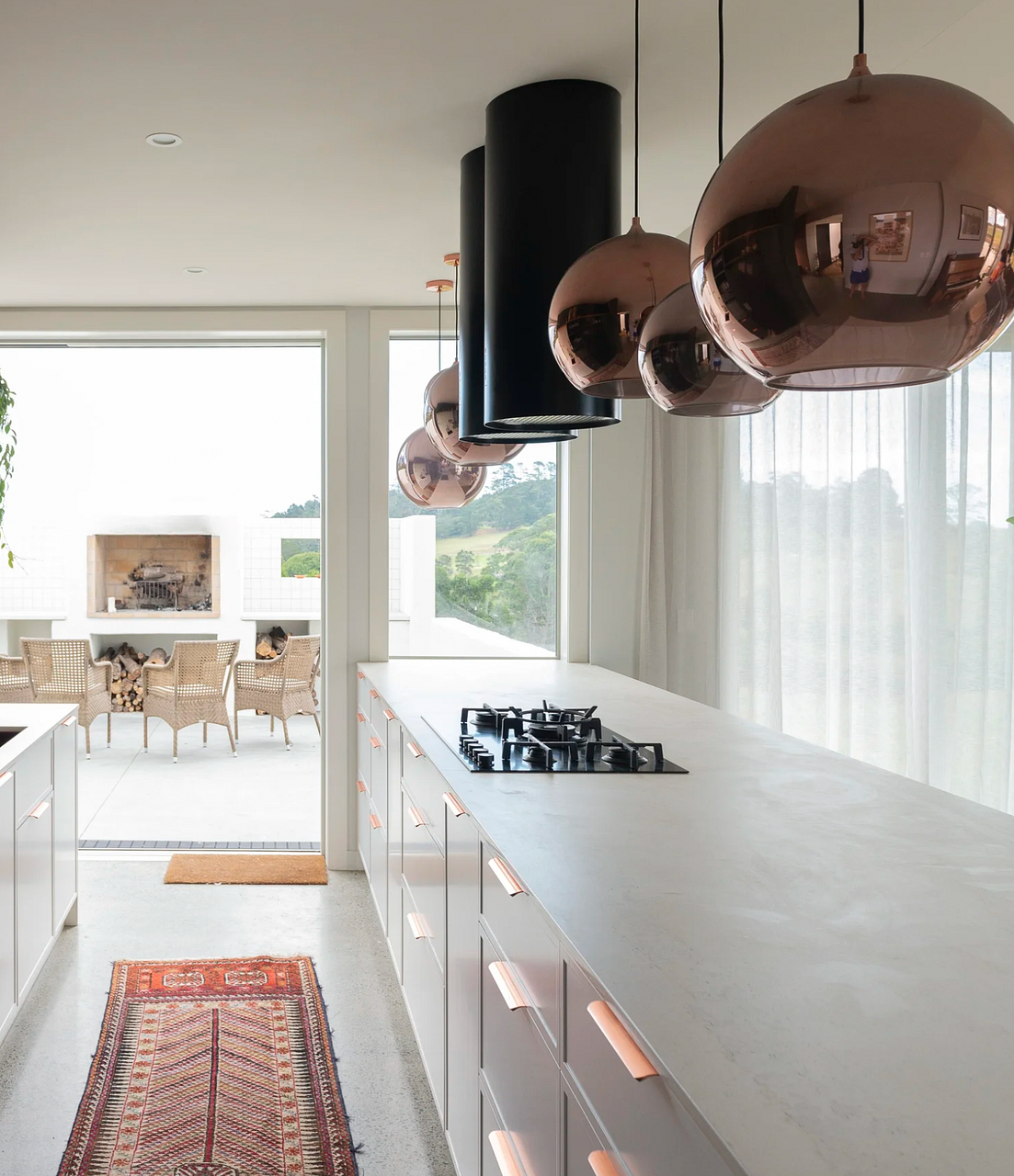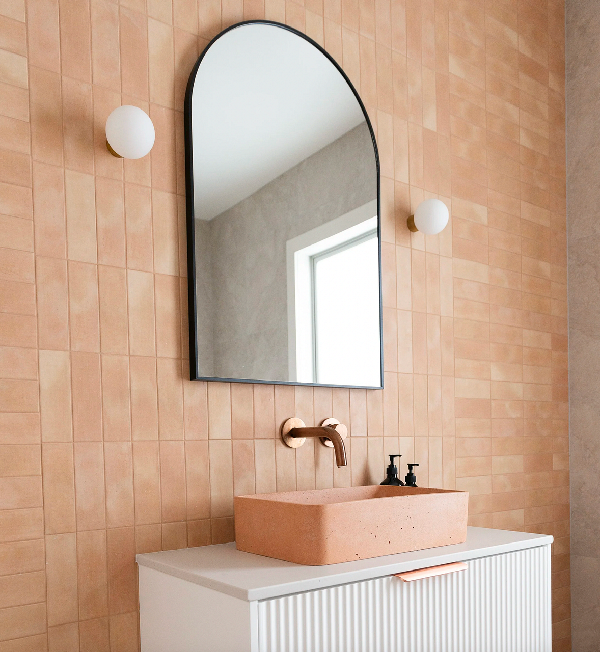 - Designer details – peach tiled bathrooms, concrete basin, copper pendants, industrial kitchen features