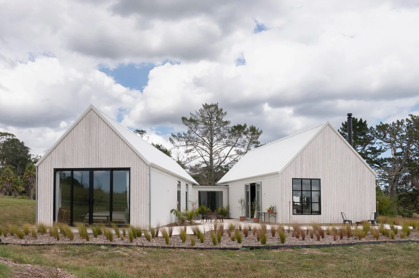 - Scandinavian-inspired design with striking pink timber gable ends and crisp white cladding