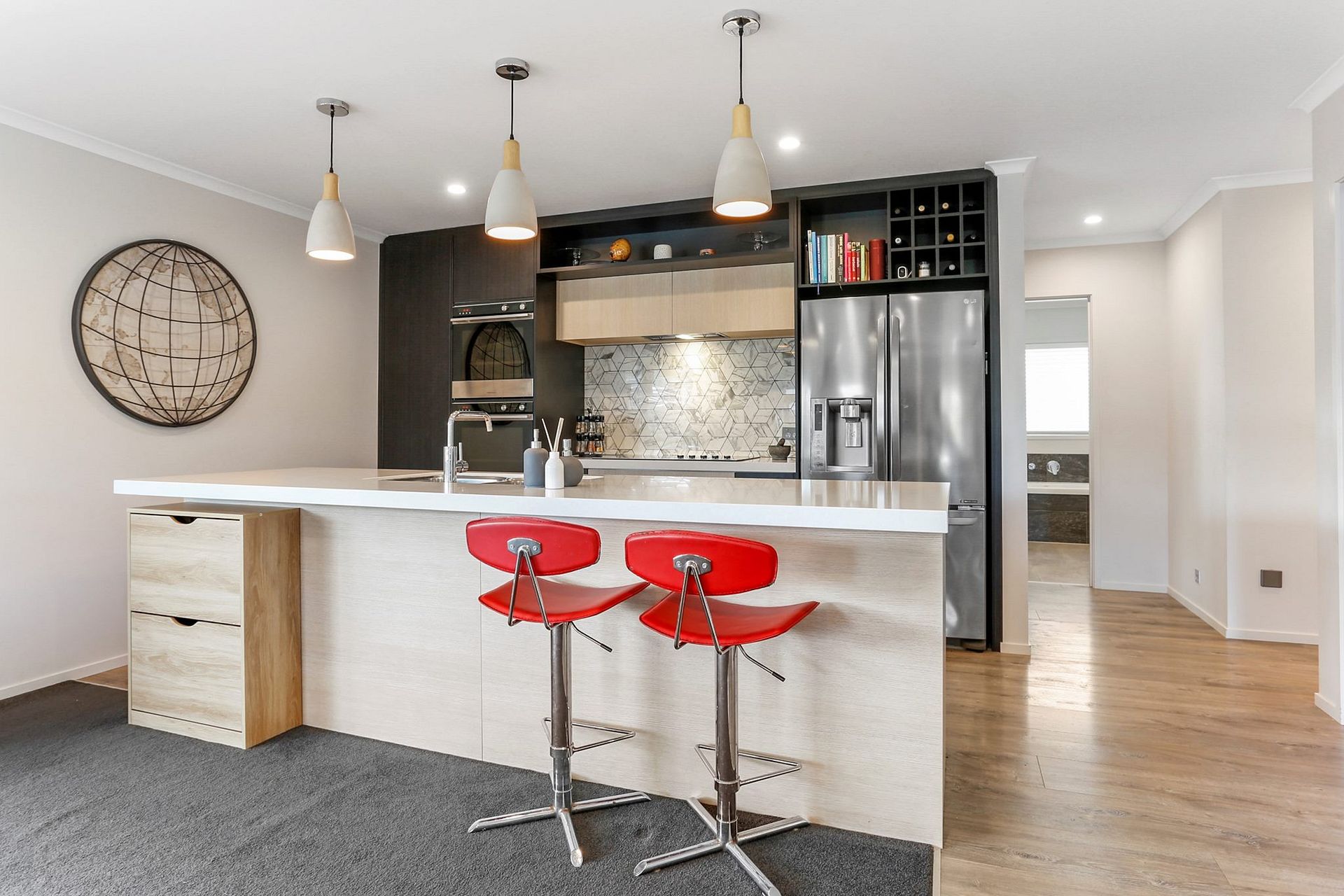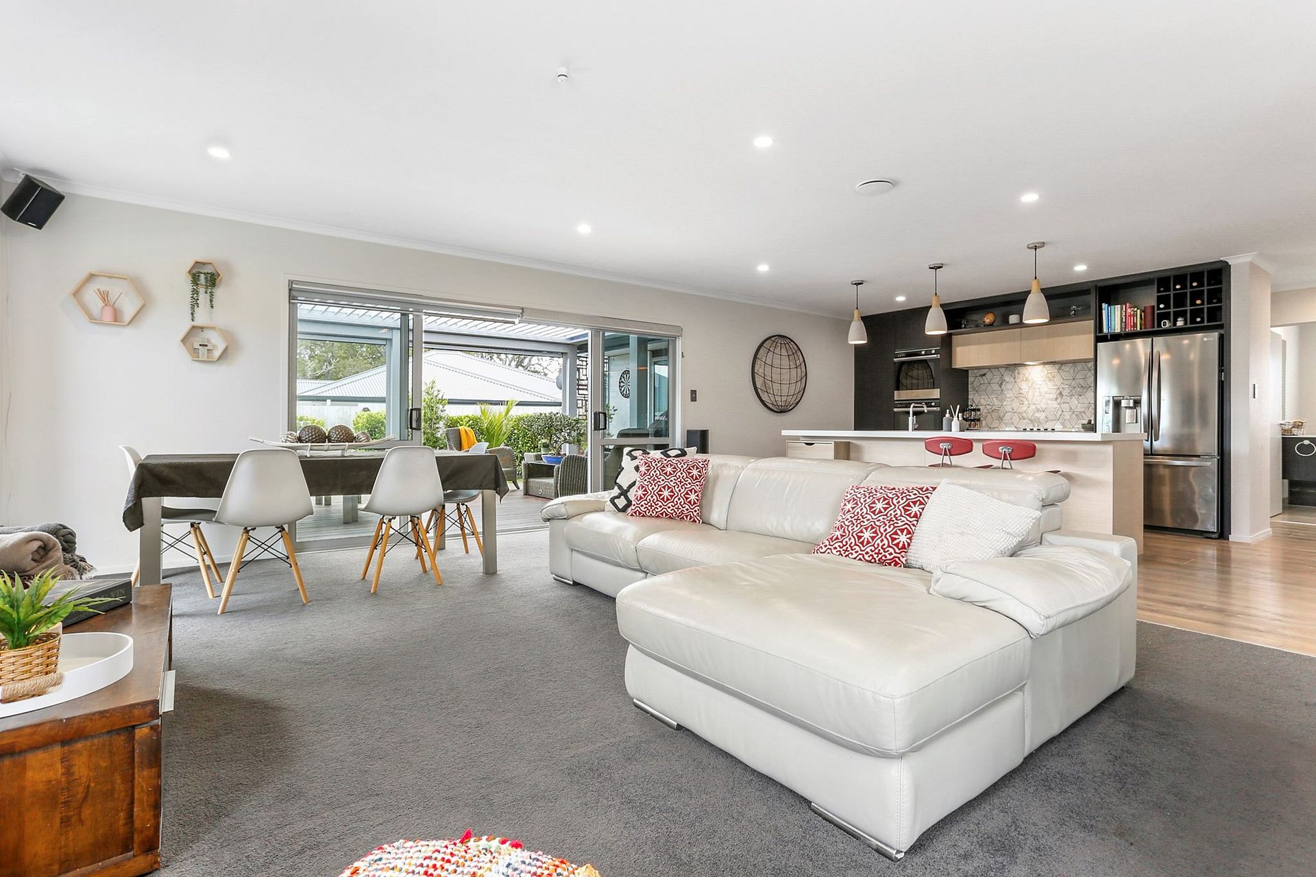 A fully fenced backyard has beautiful AstroTurf, which is durable, easily maintained, and great for kids kicking a ball around. A neat carpeted double garage larger than normal size, with internal access and additional storage space completes the picture. Amenities include proximity to motorways, local shopping, and the beautiful surroundings.