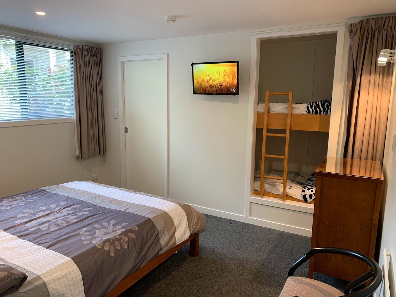 The Queen bedroom has two children's bunks built into the wall. They can be hidden away behind the curtain if not used, or modified to use for storage instead.
