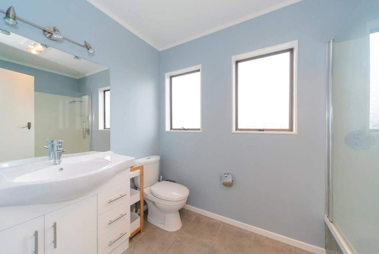 Modern bathroom with shower over bath. Gas continuous hot water (LPG bottle rental fees paid by landlord)