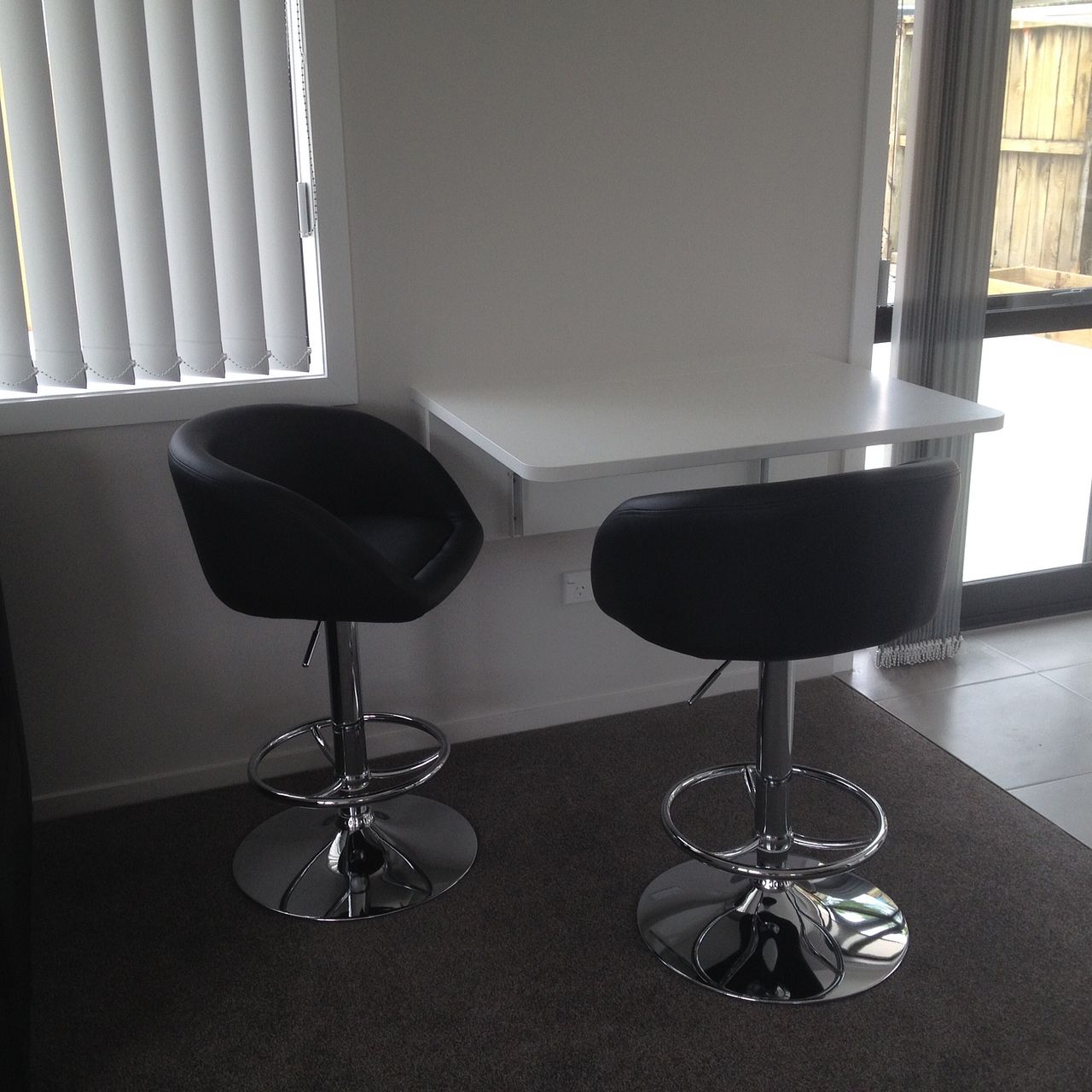 Fold down dining table, two chairs. Concrete patio. Raised garden beds.