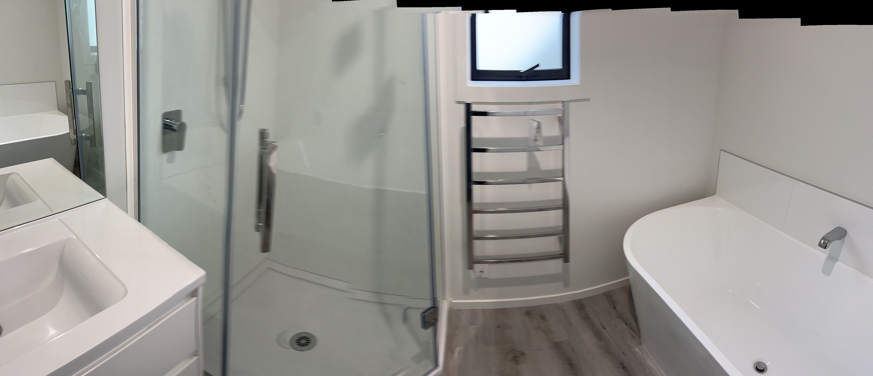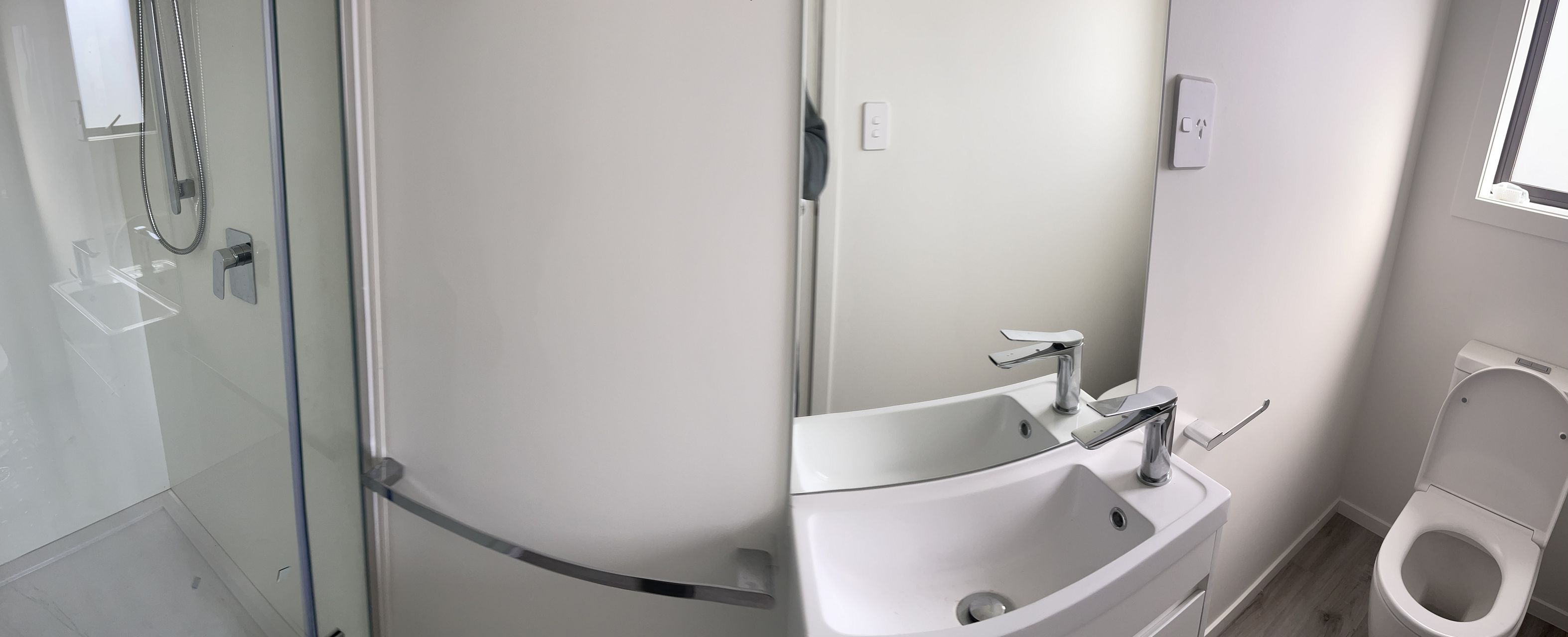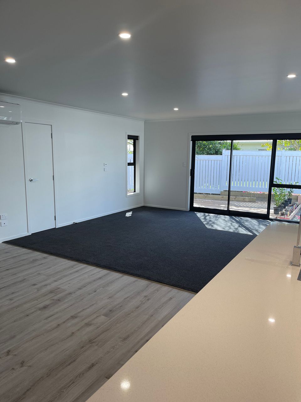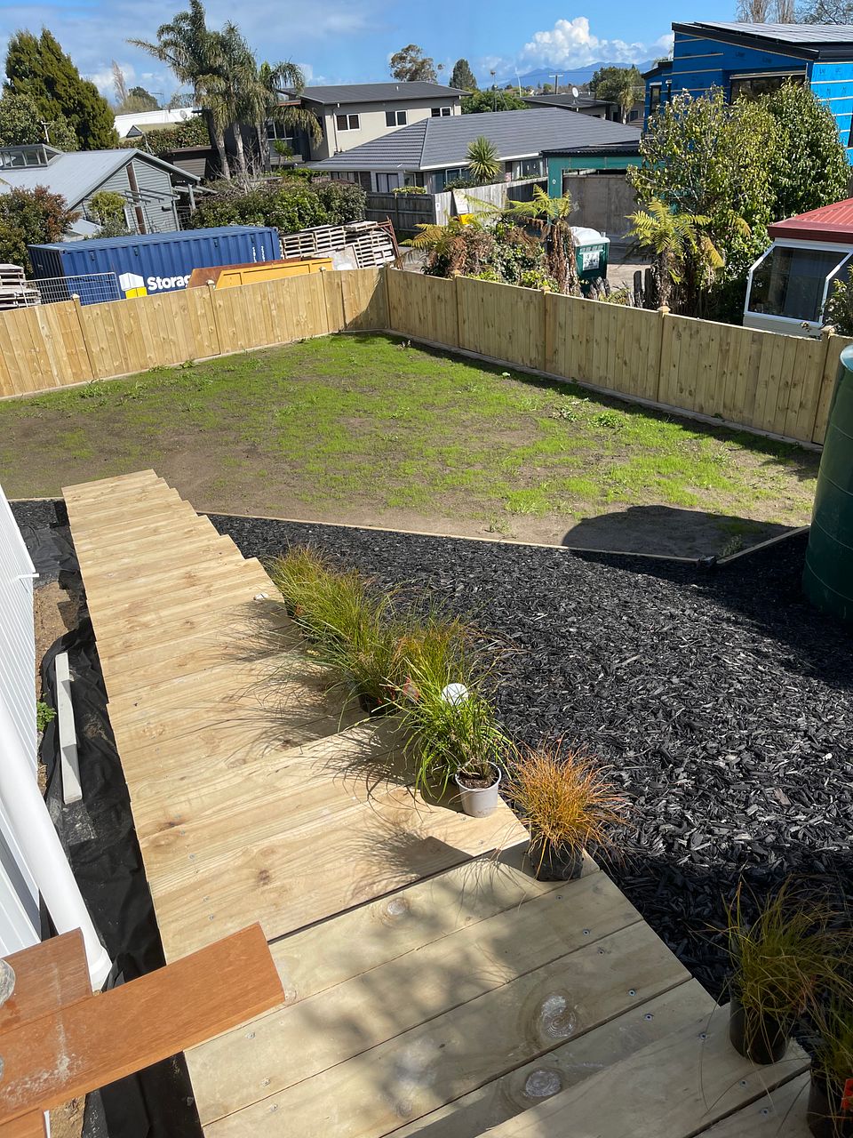 Our new three bedroom house (own site) with ensuite and single I/A garage. A large sunny deck with Indoor outdoor flow. A nice backyard. Down a private ROW. Bosch appliances, Engineered Stone bench top. Double glazed, Hear pump. Modern. New. The driveway is now in and the landscaping complete.