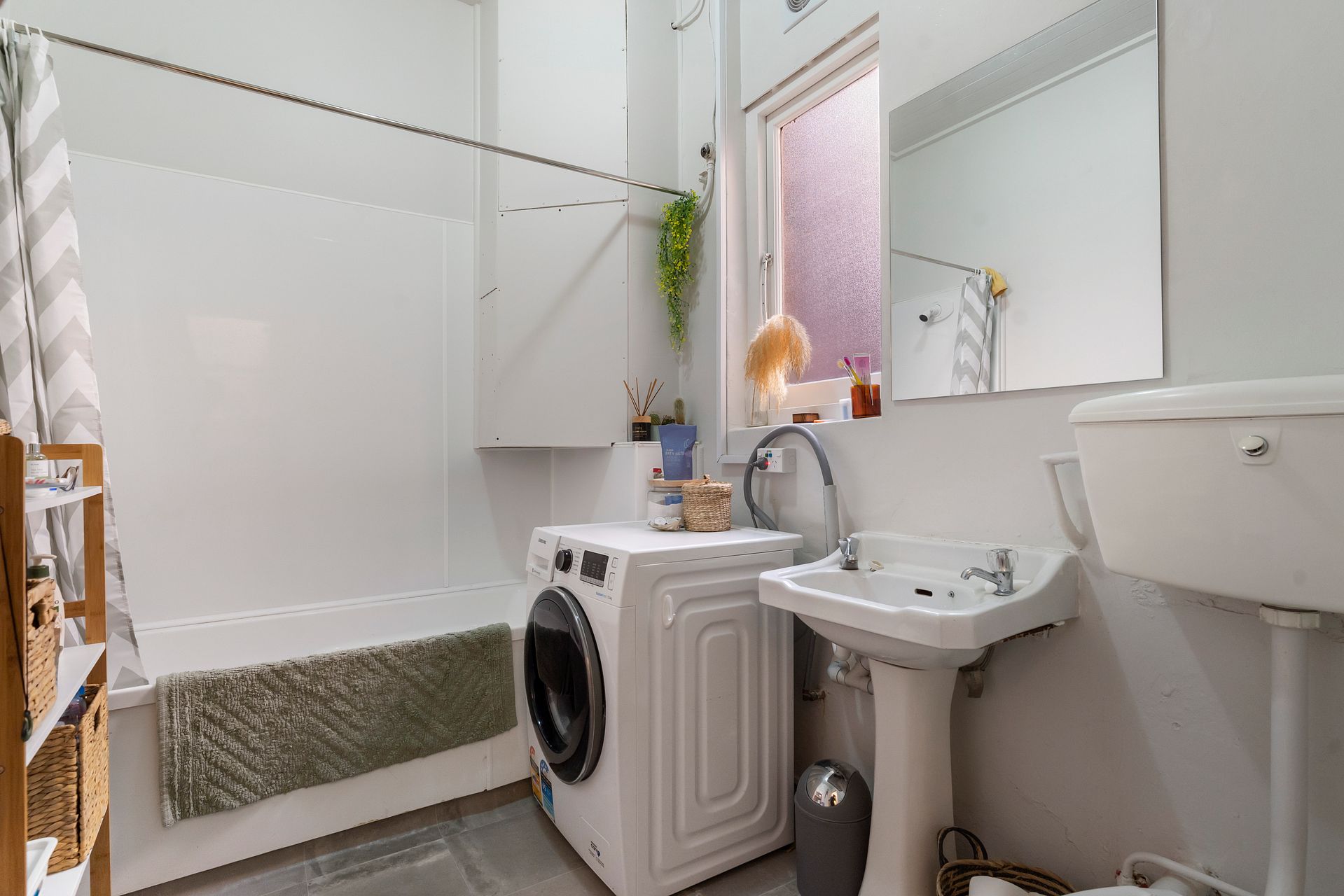 Bath and shower with space for washing machine in bathroom.