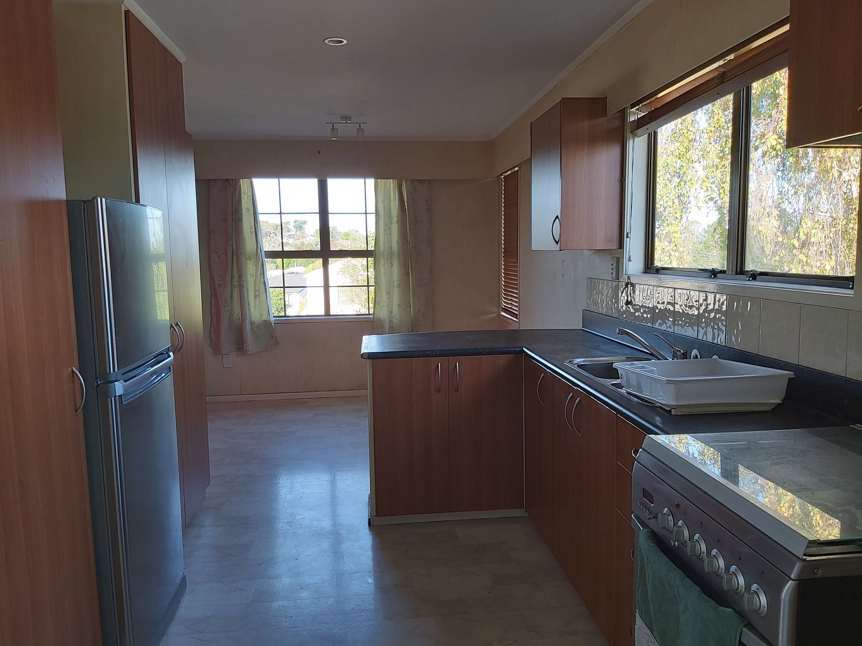 - Modern open style kitchen/dining with cook top, oven and fridge