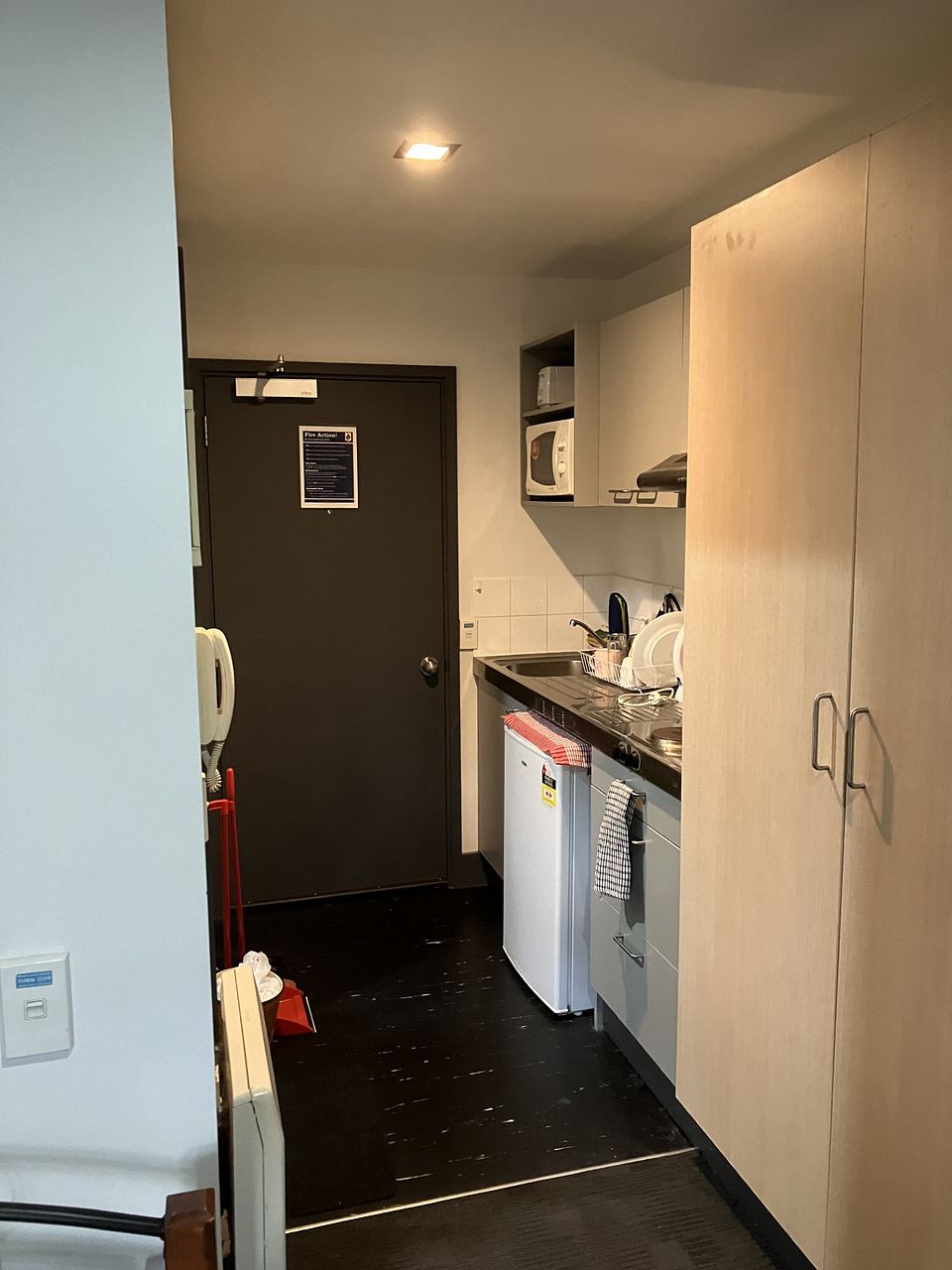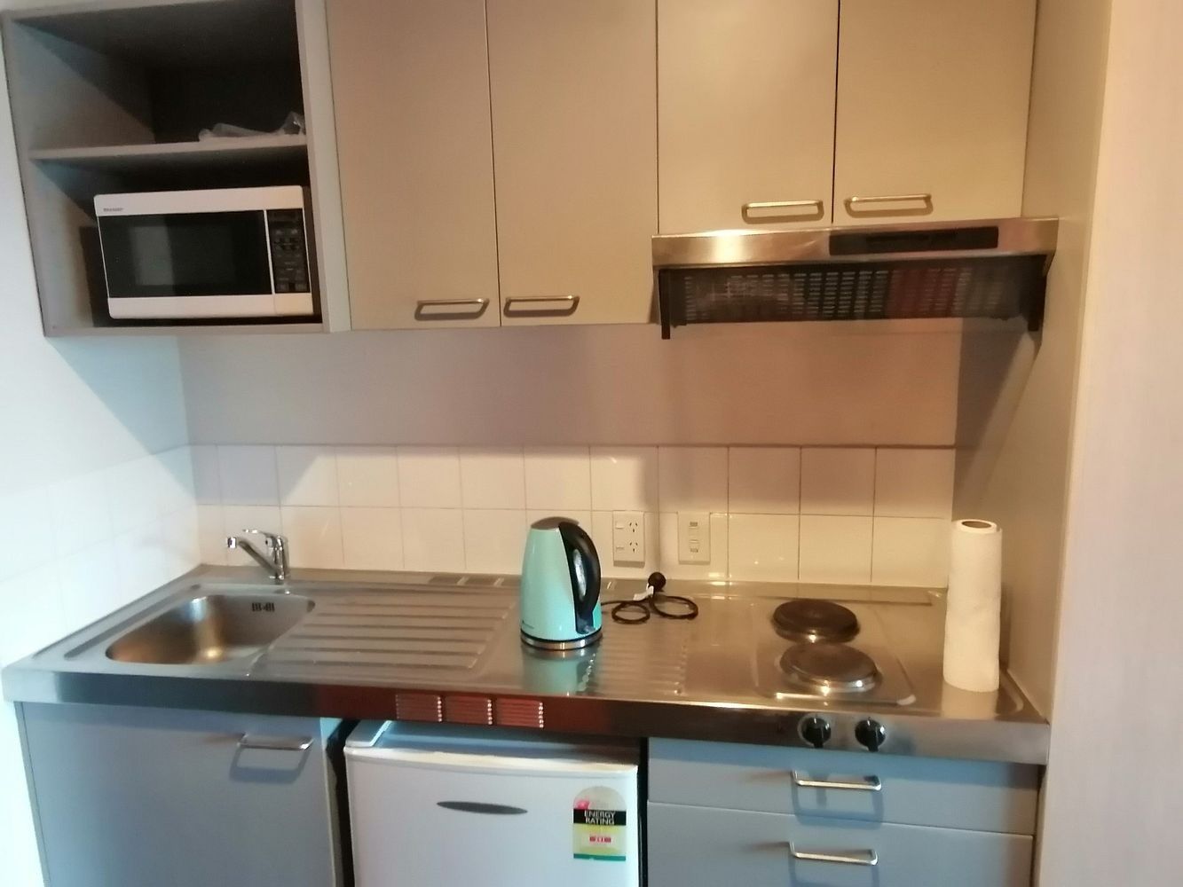 Has kitchenette, hob, microwave, oven, kitchenware, fridge, pantry. There is also available a large common lounge , games room and common laundry with washing machines and dryers ($3).
