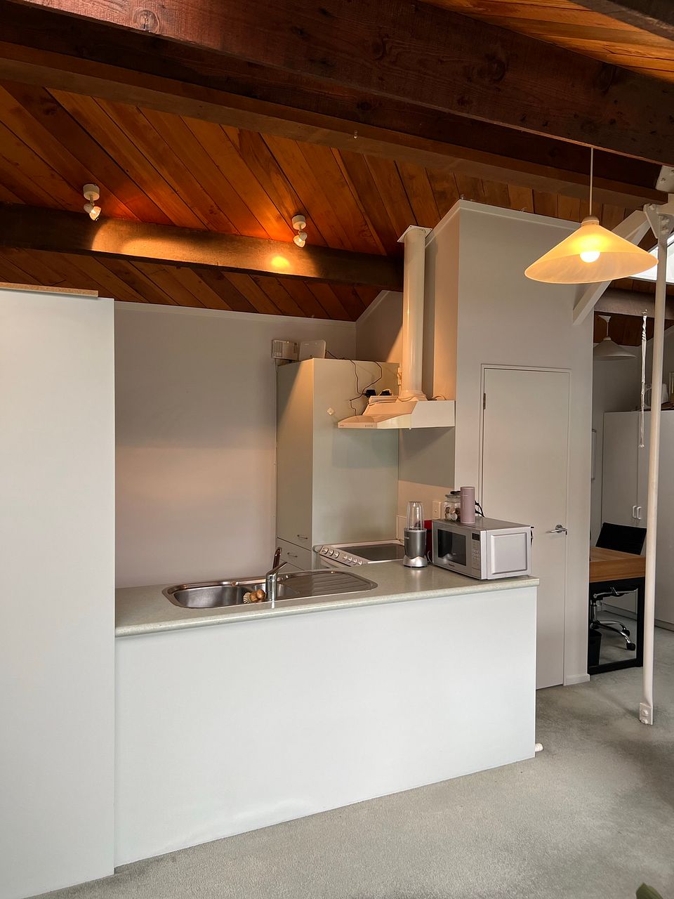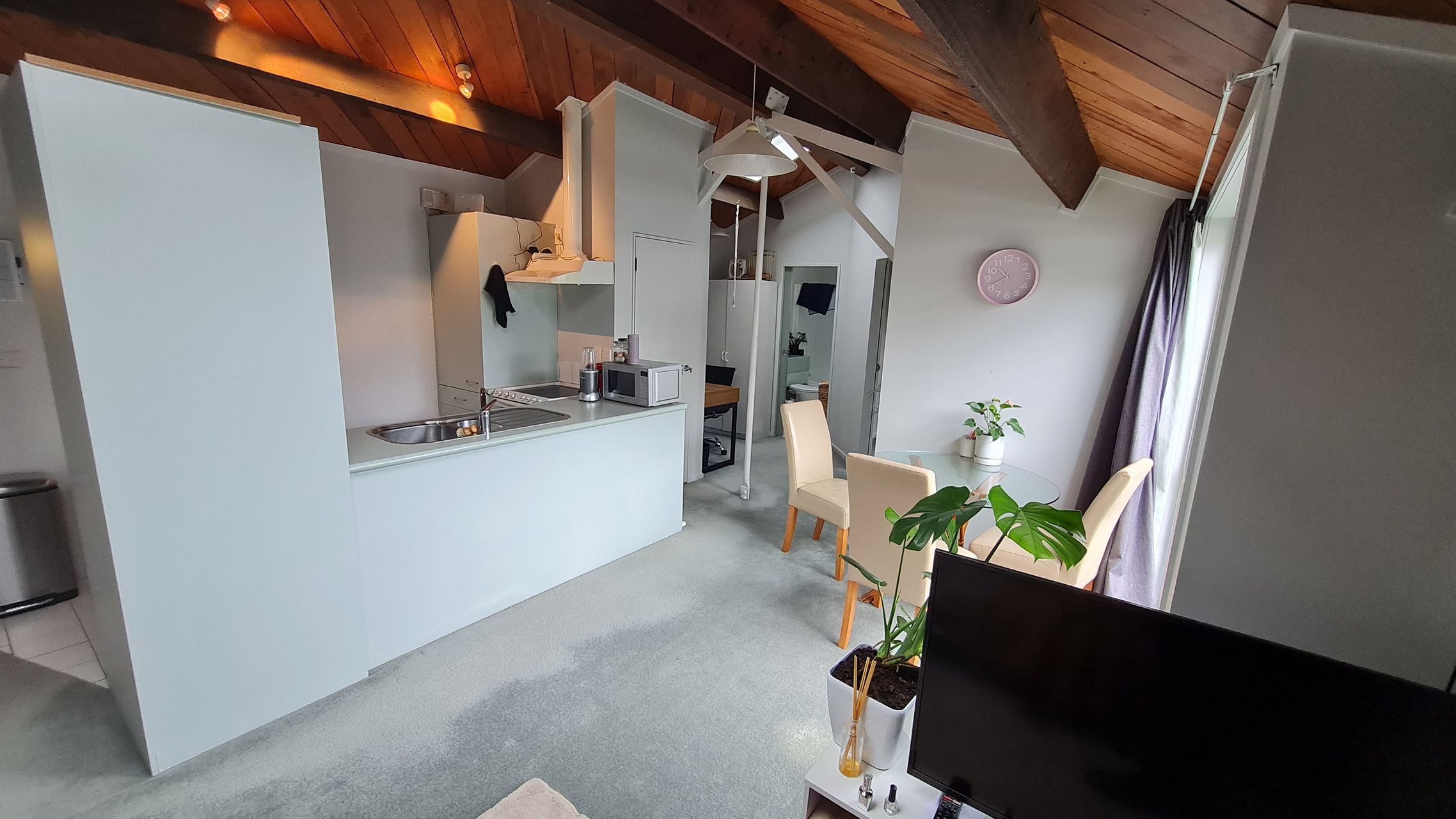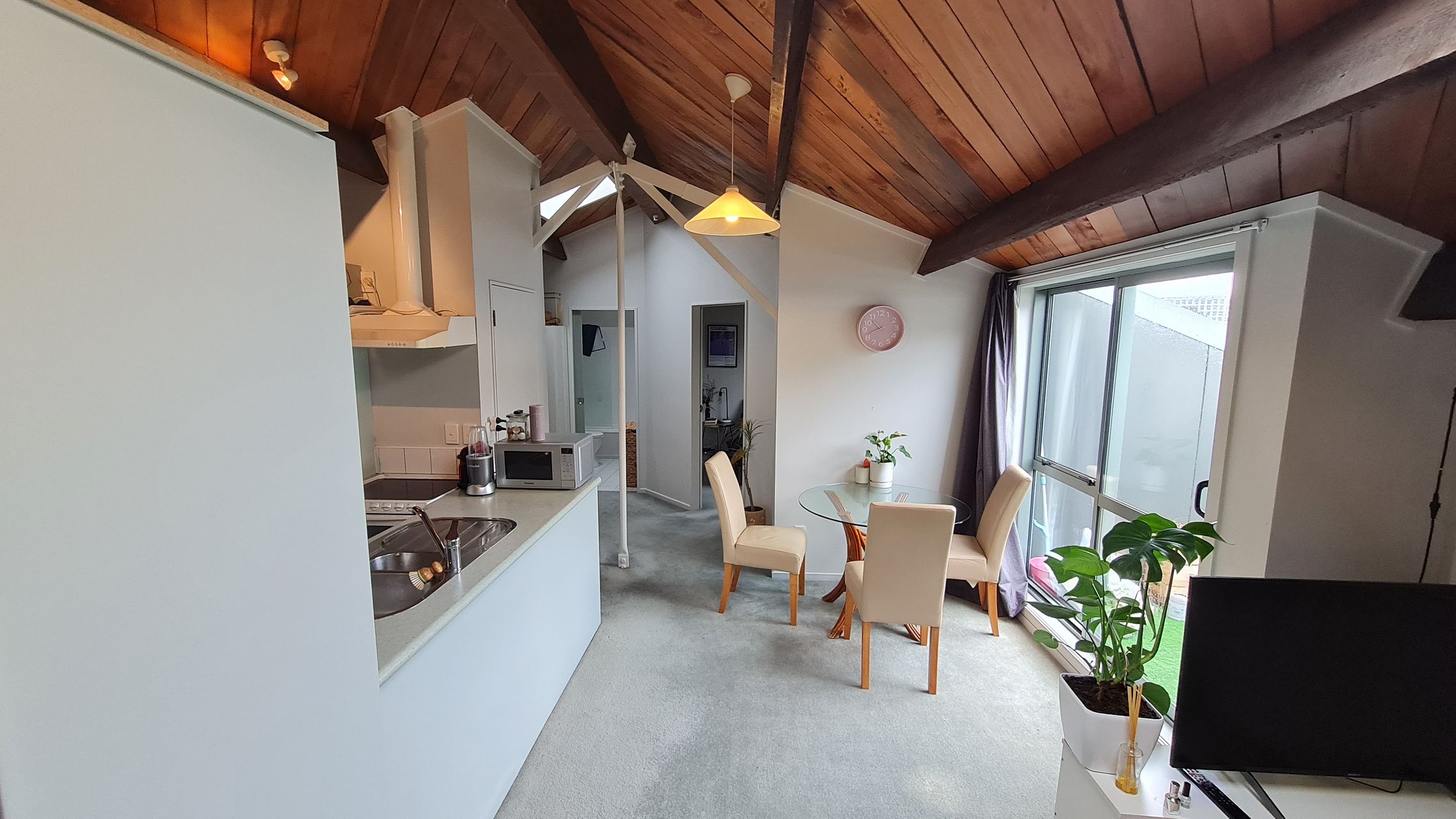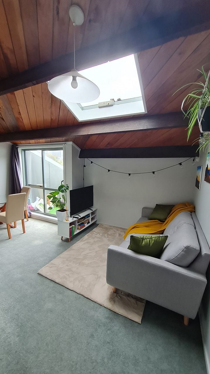 Once inside, enjoy the open plan kitchen/living area with good natural light from skylights that can be opened for secure ventilation, a cosy wooden ceiling, and carpet and tiles in all the right places. A single large bedroom with built-in wardrobe is complemented by a bathroom with a bath as well as a shower.