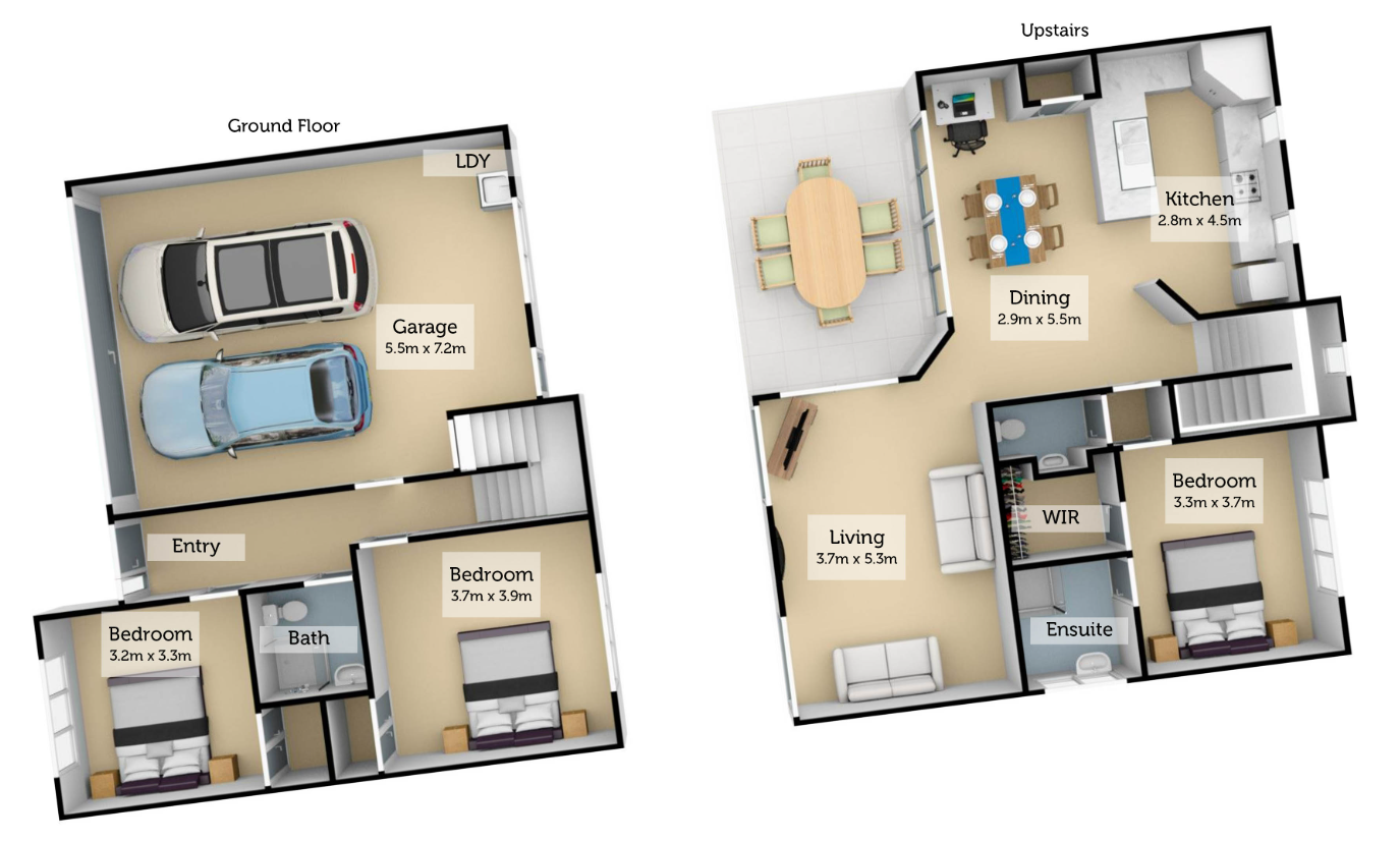 The home is 160sqm and split over two levels, with two bedrooms, a bathroom, and a double internal-access garage downstairs. Upstairs you’ll find the open-plan living area, sunny balcony, and the master bedroom with an ensuite and walk-in wardrobe. Gas heating and hot water, along with a heat pump, provide year-round comfort.